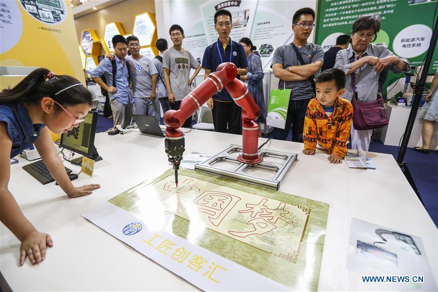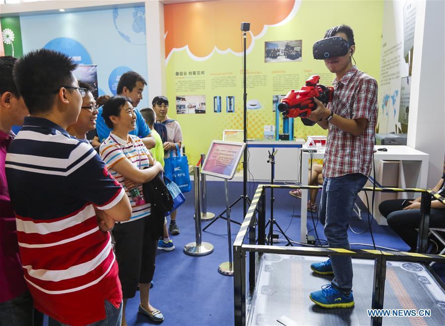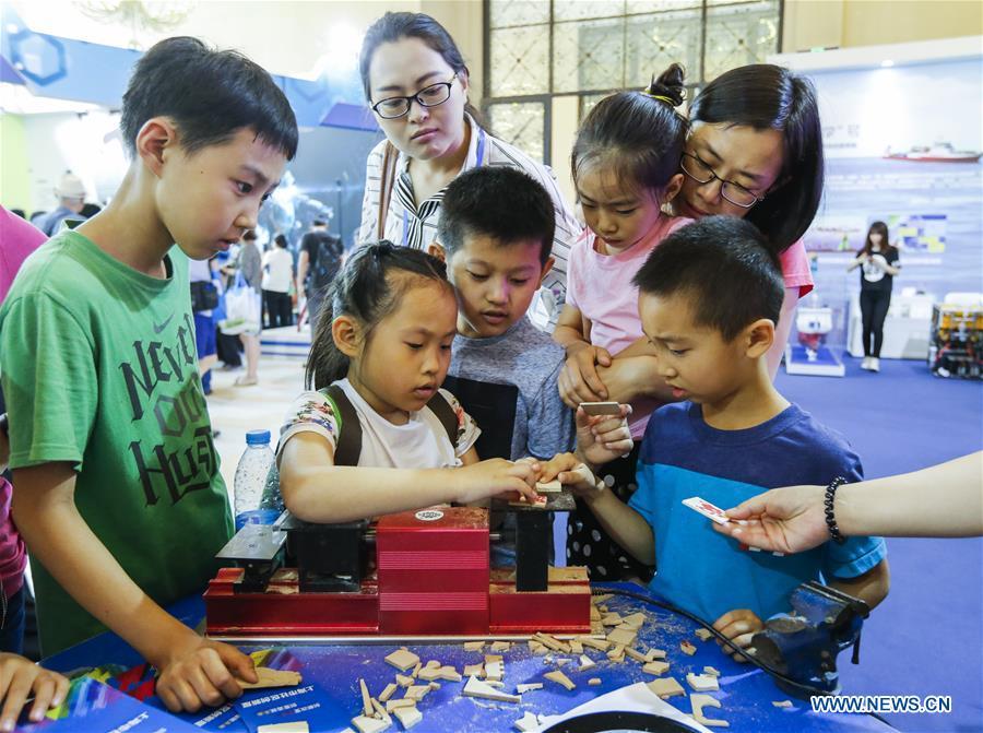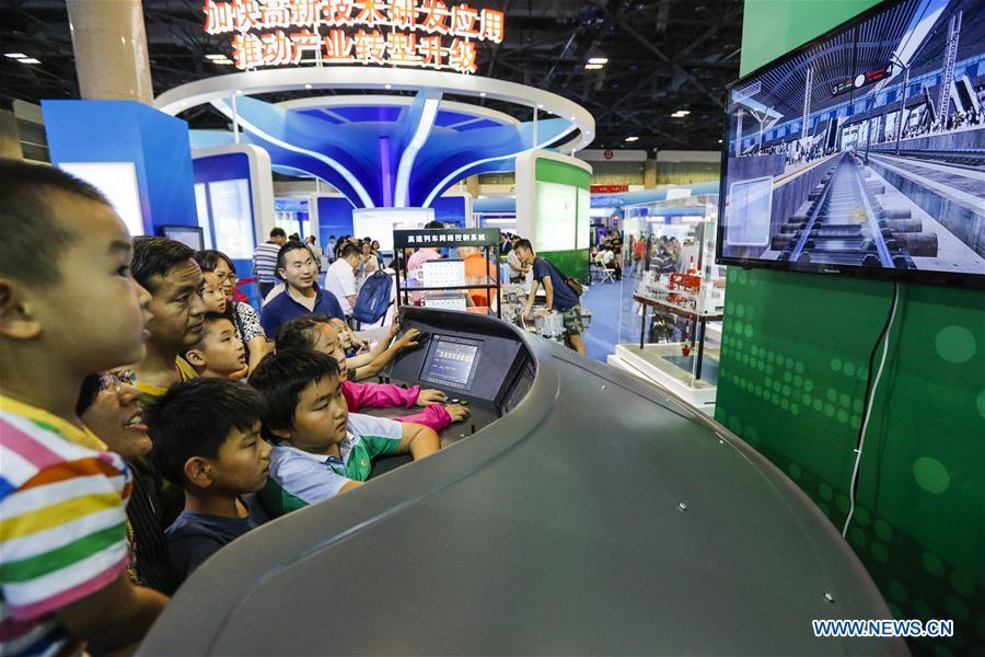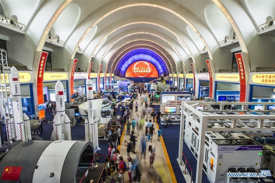 Visitors look at models of high-speed trains made by China Railway Rolling Stock Corporation (CRRC) during an exhibition on China's science and technology achievements during the 12th Five-Year Plan period (2011-2015) in Beijing, capital of China, June 4, 2016. (Xinhua/Shen Bohan)
