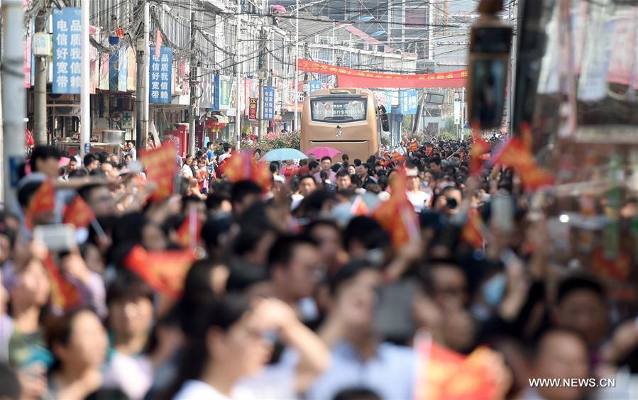 Parents and local residents see off G12 students of Maotanchang High School (including Jin'an High School) in Maotanchang Town of Lu'an City, east China's Anhui Province, June 5, 2016. A total of 19 shuttle buses carrying nearly 1,000 students set off here to examination venues in Lu'an City, for the upcoming national college entrance exam, or "gaokao", on Sunday. (Photo: Xinhua/Guo Chen)