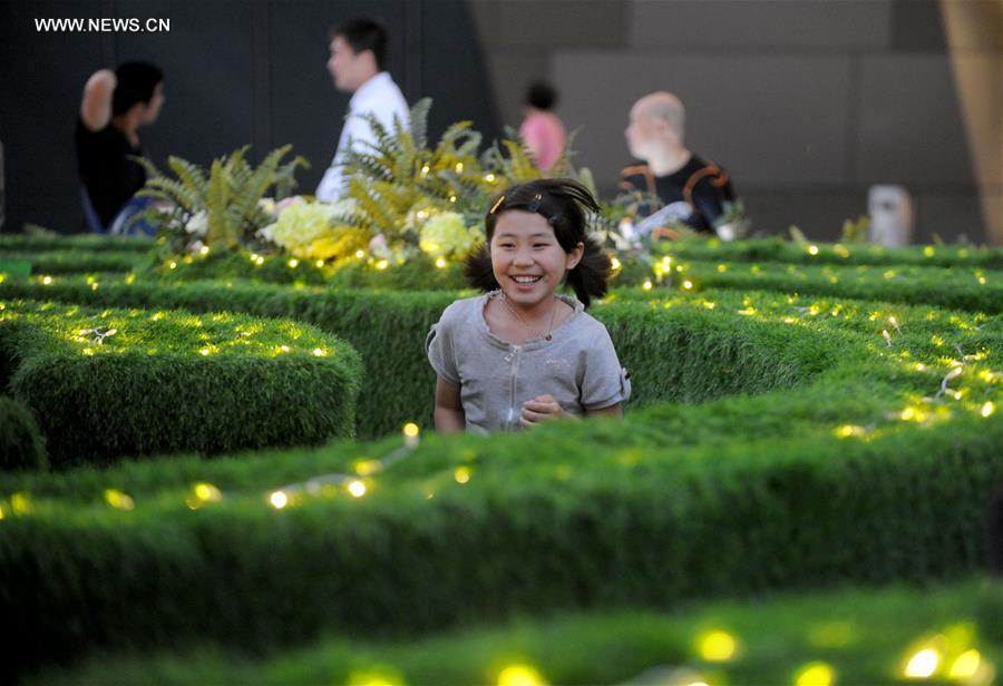 People play in a garden maze in Shenyang, capital of northeast China's Liaoning Province, June 5, 2016. A 200 square meters garden maze has been built in downtown Shenyang and attracted many people. (Photo: Xinhua/Zhang Wenkui)