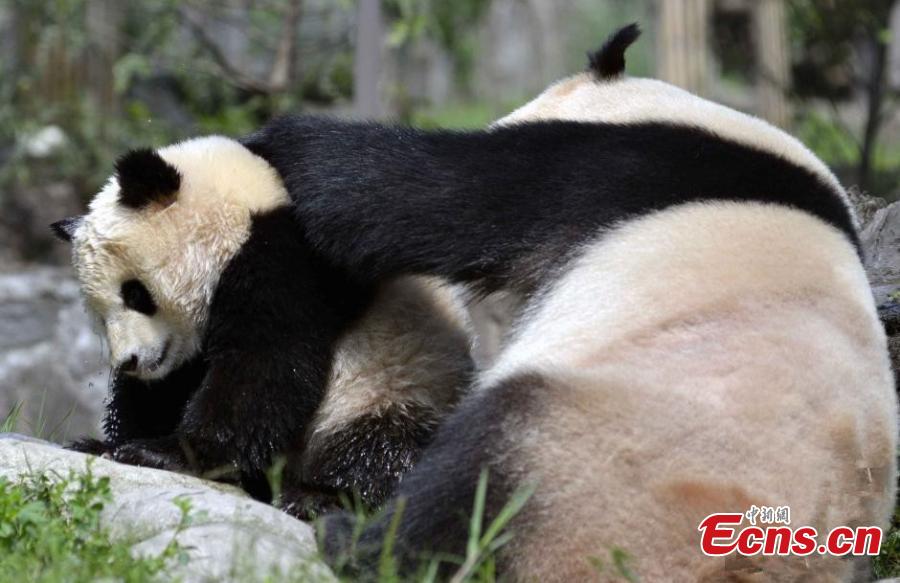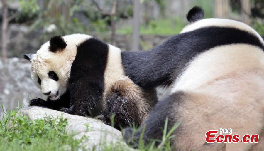 Giant panda Yaoman washes her months-old cub, which seems reluctant to be bathed, at the Dujangyan Base of the China Giant Panda Protection and Research Center in Chengdu City, the capital of Southwest China’s Sichuan Province. Temperatures rose to 30 degrees centigrade in Chengdu. (Photo: China News Service/Shu Jing )