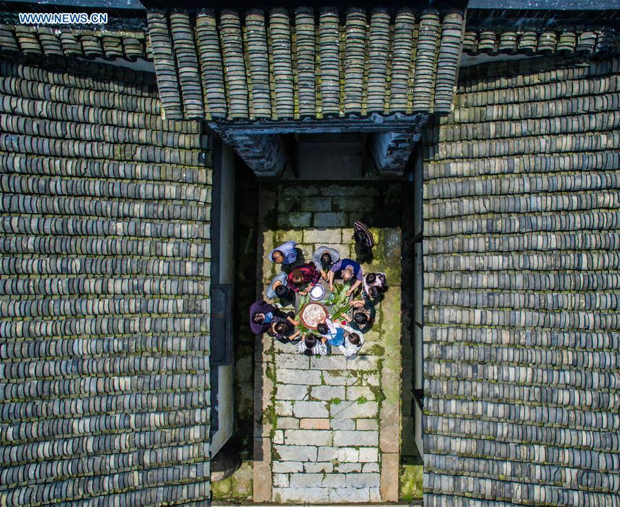 Local villagers make Zongzi, a glutinous rice dumpling wrapped in bamboo or reed leaves, to mark the upcoming Dragon Boat Festival or Duanwu in Chinese, at the yard of an old house in Yigao Village of Huzhou, east China's Zhejiang Province, June 5, 2016. Duanwu will fall on June 9 this year. (Photo/Xinhua)