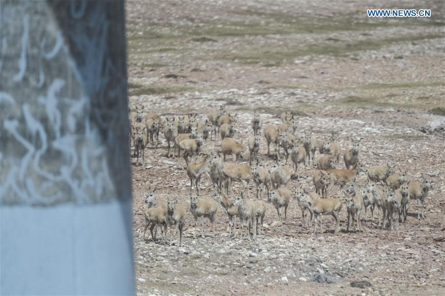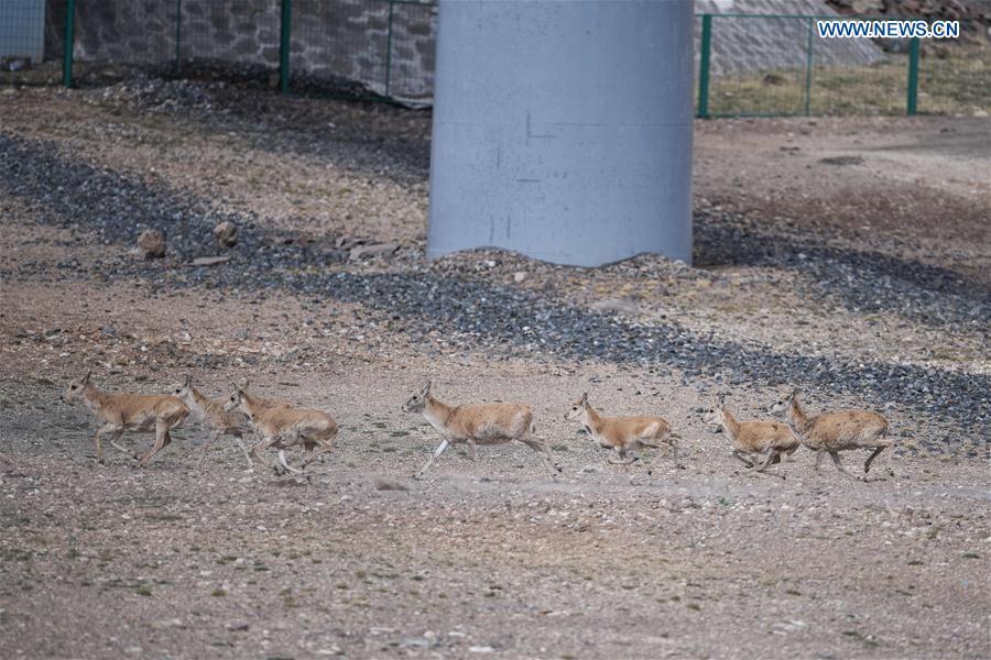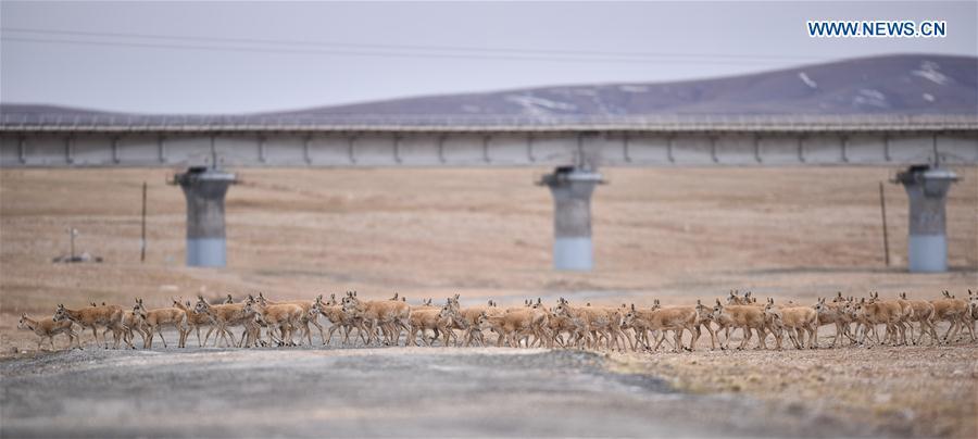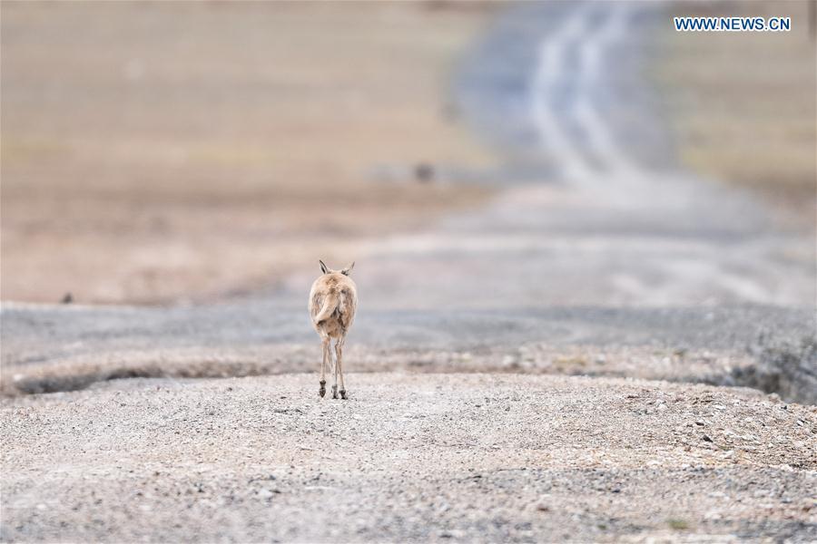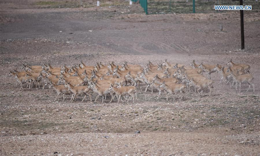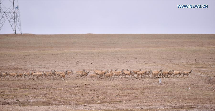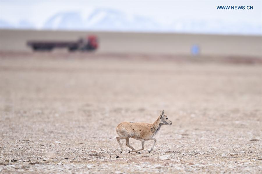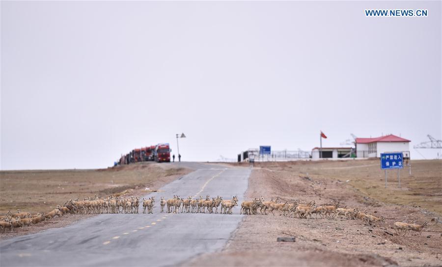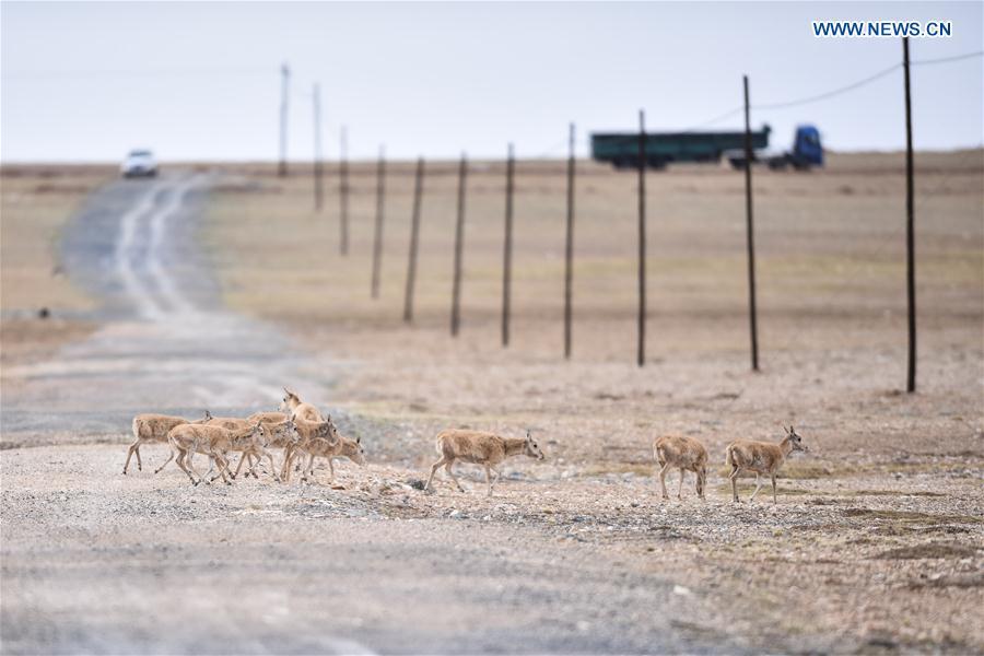 A flock of female Tibetan antelopes run to the breeding area Zhuonai Lake after crossing the Qinghai-Tibet Road in Hol Xil Nature Reserve, northwest China's Qinghai Province, June 7, 2016. Tens of thousands of Tibetan antelopes are migrating to give birth near Zhuonai Lake, which provides an ideal environment for breeding. (Photo/Xinhua)