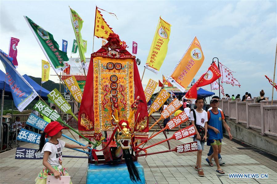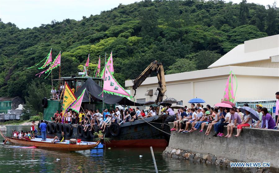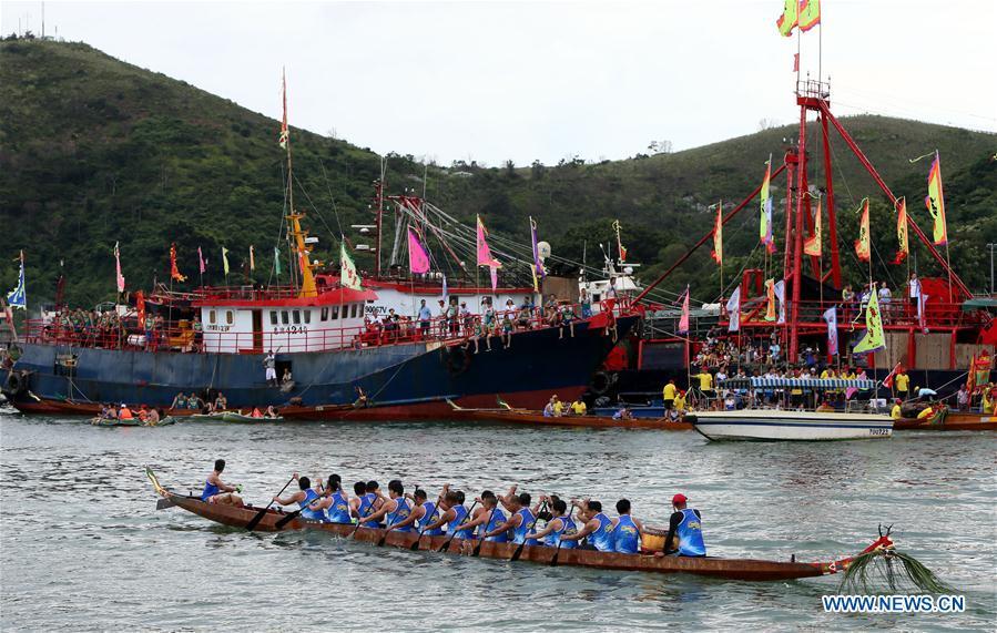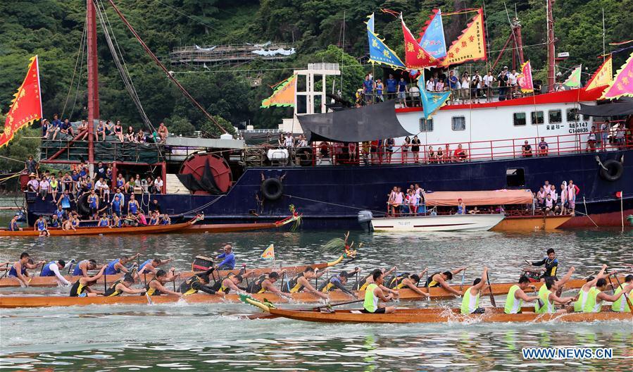 Photo taken on June 9, 2016 shows a dragon boat in a dragon boat race in Tai O, south China's Hong Kong. Tai O held the annual dragon boat race on Duanwu Festival on Thursday. (Xinhua/Li Peng)