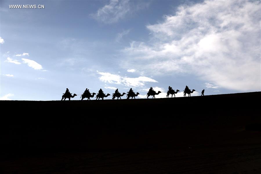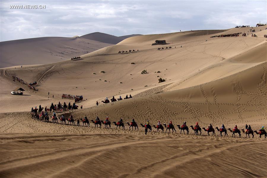 Tourists enjoy the camel safari at the Crescent Spring and Singing Sand Dune scenic area in Dunhuang, northwest China's Gansu Province, June 10, 2016. Chinese people enjoyed their three-day Dragon Boat Festival vacation in various ways. (Xinhua/Zhang Xiaoliang)