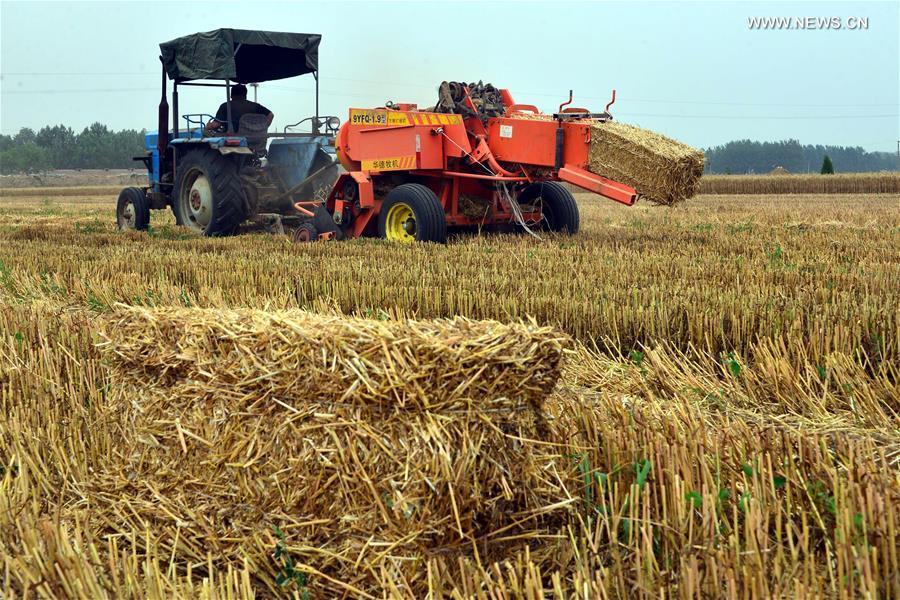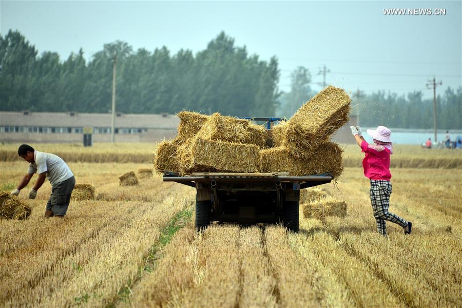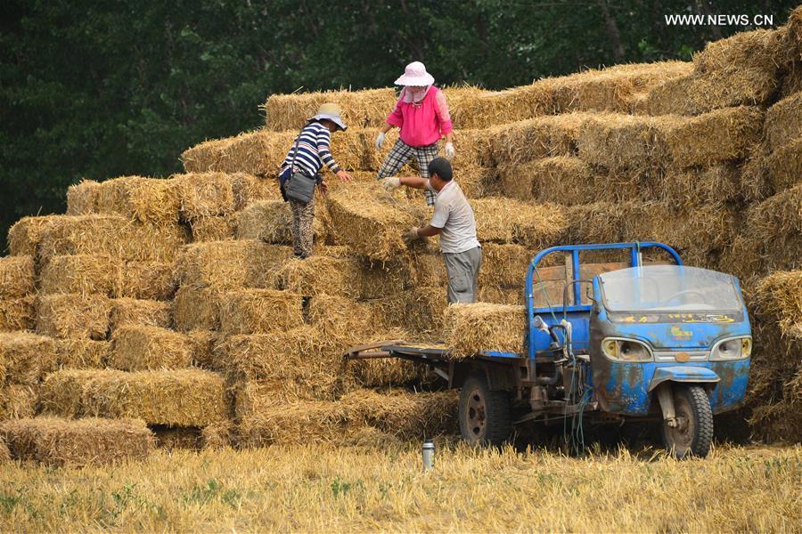 Farmers collect straw in field in Liaocheng, east China's Shandong Province, June 10, 2016. Local farmers recycled straw for electricity generation, papermaking and other environmentally friendly uses. (Xinhua/Zhao Yuguo)