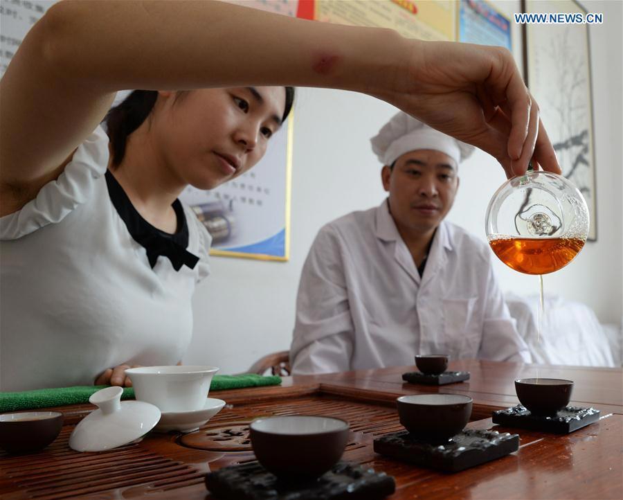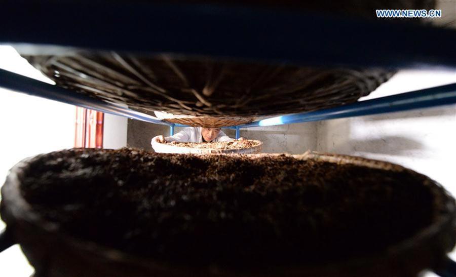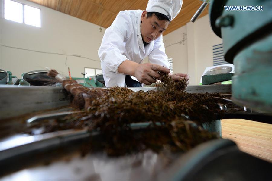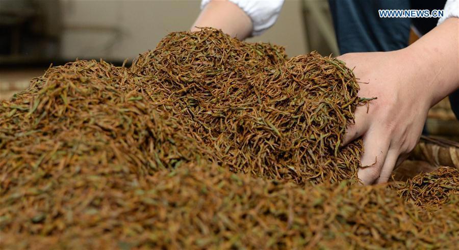 Tea leaves are seen in Dalian village of Tuxi township in Fenggang county of Zunyi city, Southwest China's Guizhou province, June 9, 2016. The county has 450,000 mu (30,000 hectares) of tea garden and the tea industry here has become a pillar industry. (Photo/Xinhua)