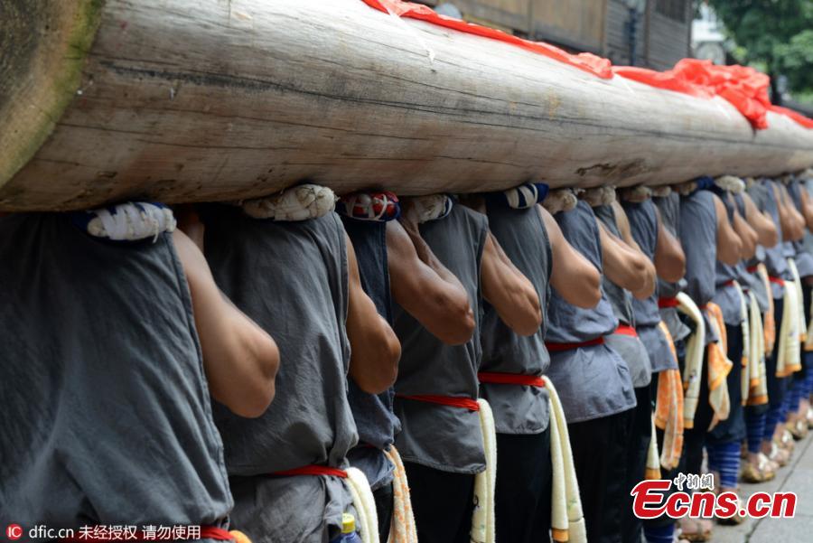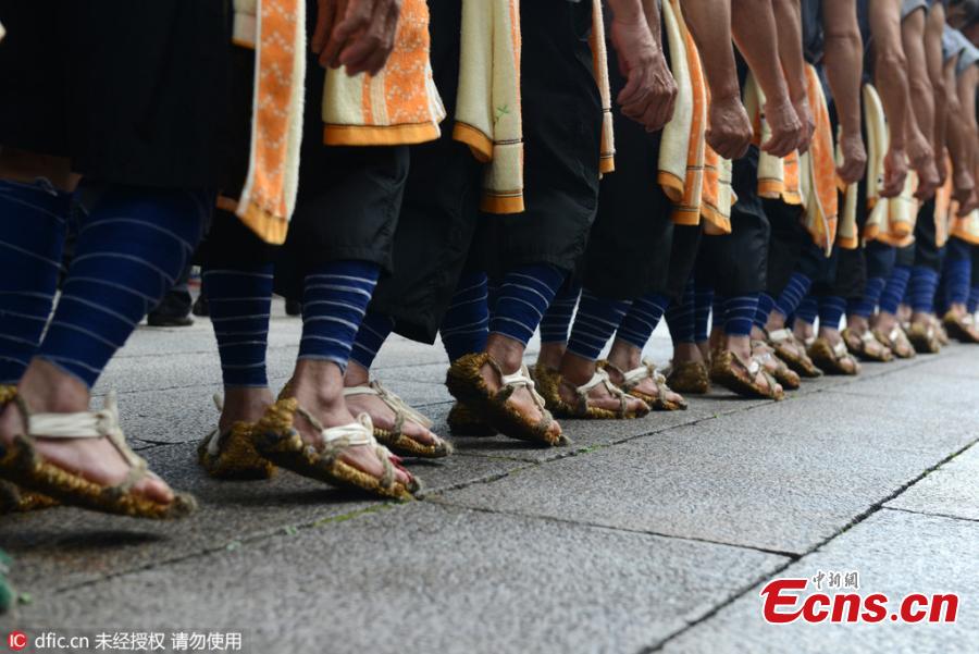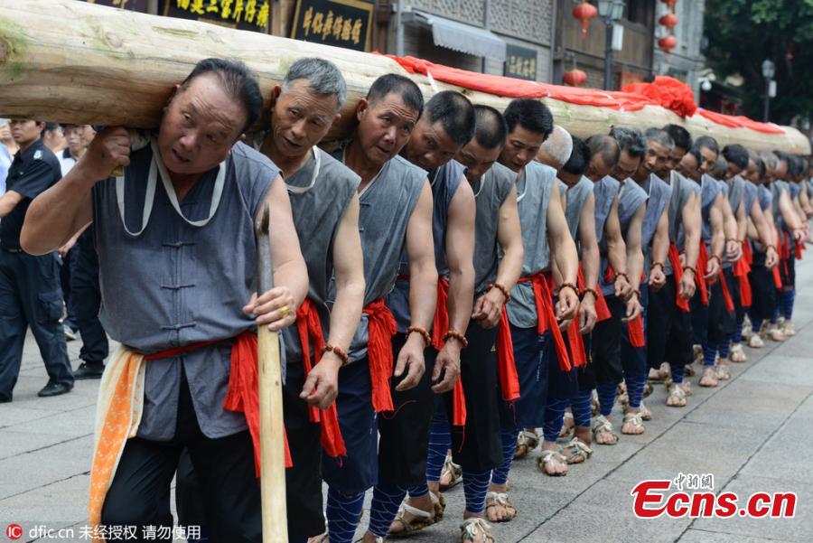 Twenty-four men aged in their 60s carry a trunk while marching during an event to mark Cultural Heritage Day in Fuzhou City, the capital of East China’s Fujian Province, June 11, 2016. The men from Shanghukou Village in Xiaotao Town moved to the rhythm of a chant while carrying the trunk, which measured 12 meters long and 1.4 tons in weight. A total of 246 folk artists representing 26 forms of cultural heritage attended the event. In 2005, China declared the second Saturday of June would be celebrated as Cultural Heritage Day each year in order to promote the protection of the country’s rich cultural resources. (Photo/IC)