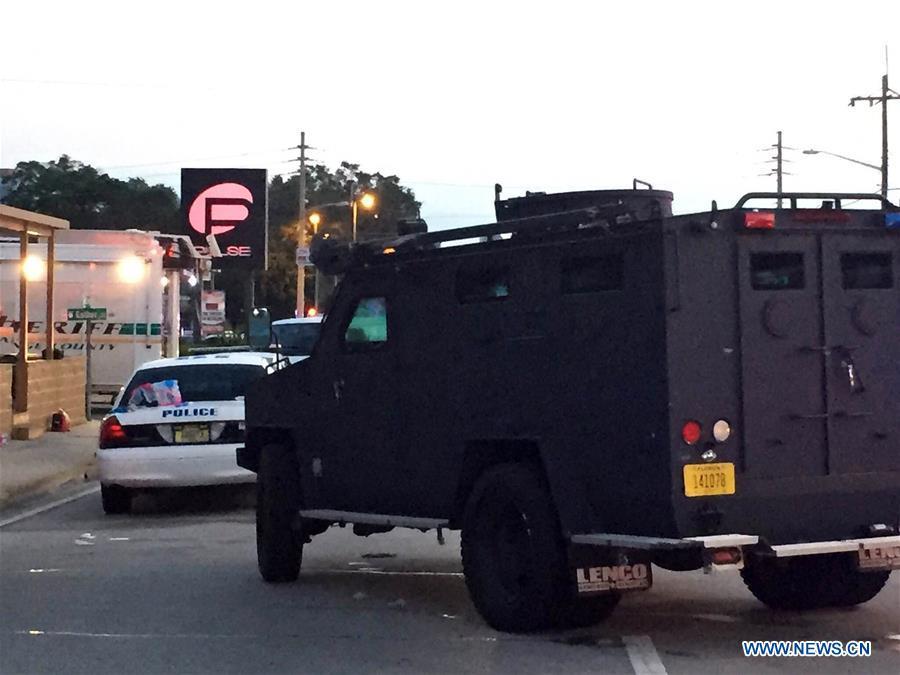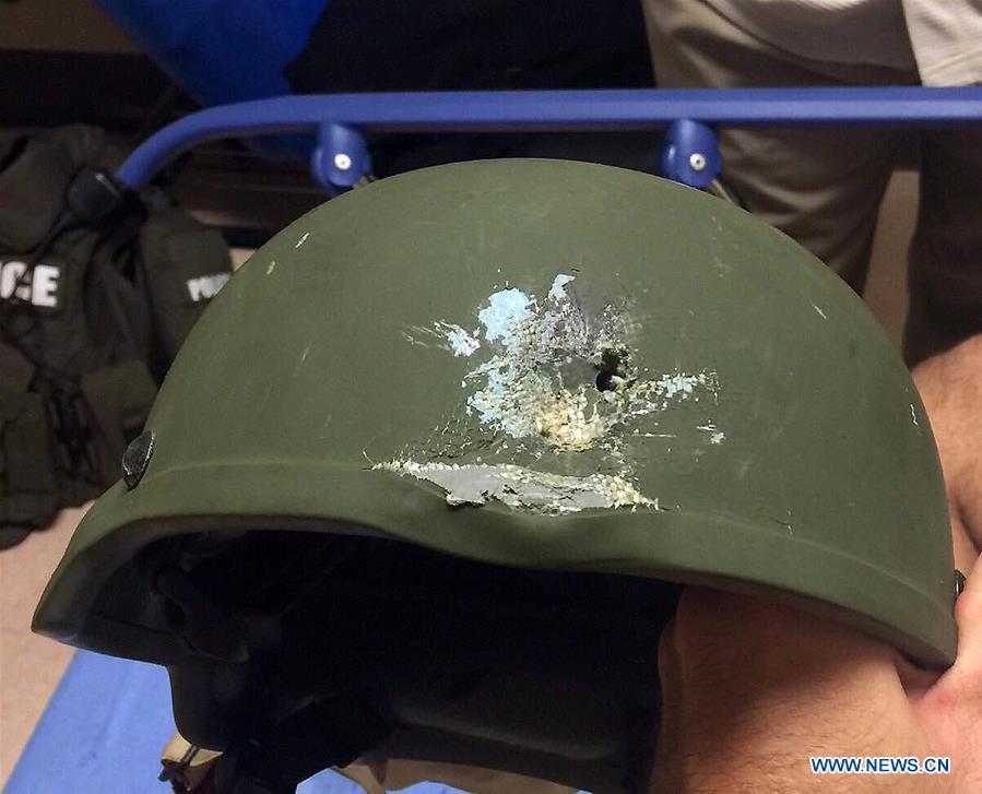 Photo provided by Orlando Police Department shows the helmet of a police office, which was hit by a bullet during police operation against the suspect of the shooting incident, in Orlando, Florida, the United States, June 12, 2016. About 50 people were killed and 53 others wounded early Sunday morning in a shooting incident at a gay nightclub in Orlando, Florida, according to Orlando mayor. (Xinhua/Orlando Police Department)
