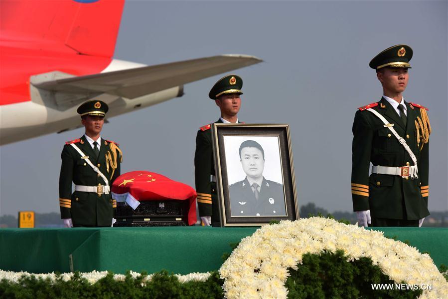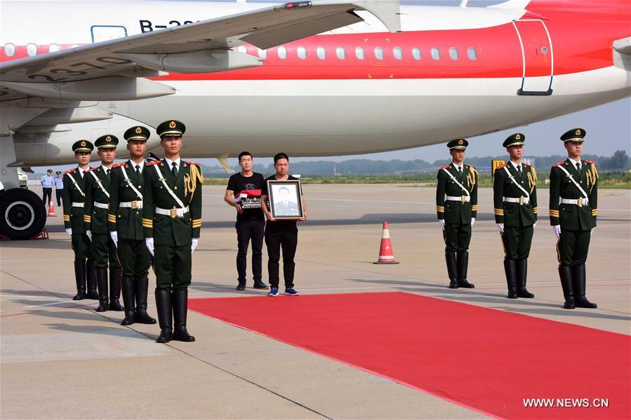 The ashes of Shen Liangliang, a Chinese UN peacekeeping soldier killed in a recent terrorist attack in Mali, is escorted back to the Xinzheng International Airport in Zhengzhou, capital of central China's Henan Province. Shen's home is in Wenxian County in the province. He was the 11th Chinese serviceman killed in UN peacekeeping missions abroad. His body was brought back to China on Thursday afternoon. (Photo/Xinhua)