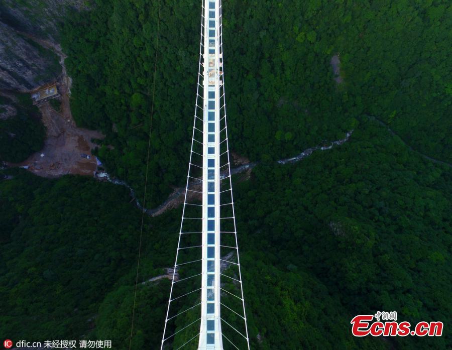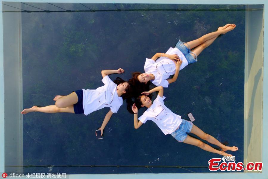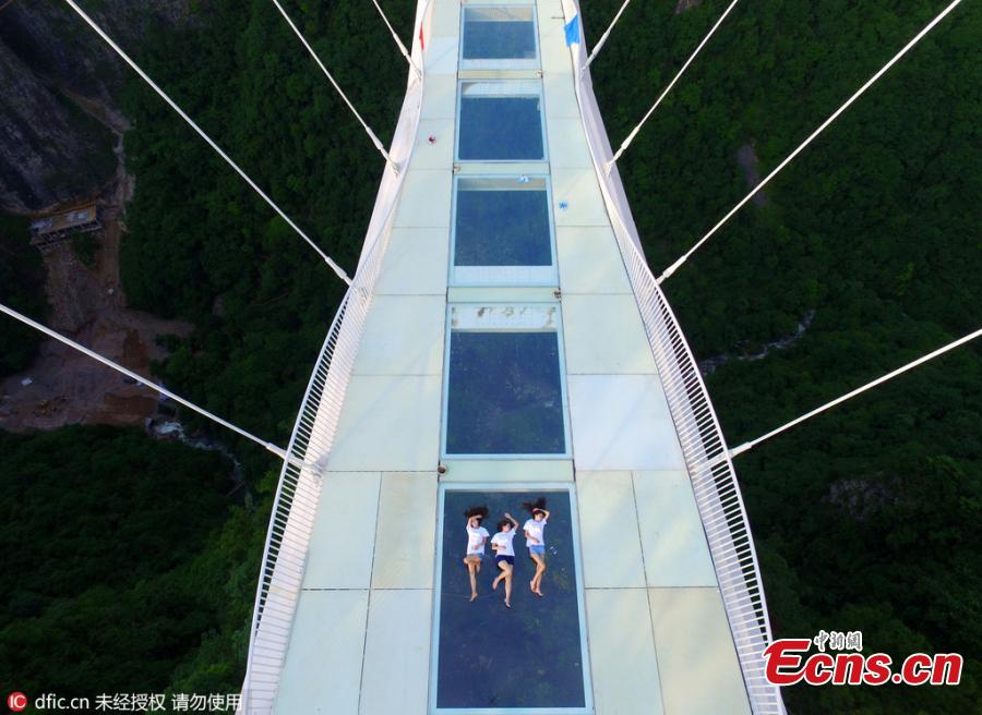 Three women pose for photos on the world's longest and highest glass-bottom bridge in Zhangjiajie National Forest Park, Hunan Province, June 12, 2016. Set amid the dramatic landscape of the park, the bridge is 430 meters long, 6 meters wide and spans a 300-meter vertical drop. (Photo/IC)
