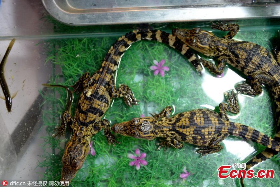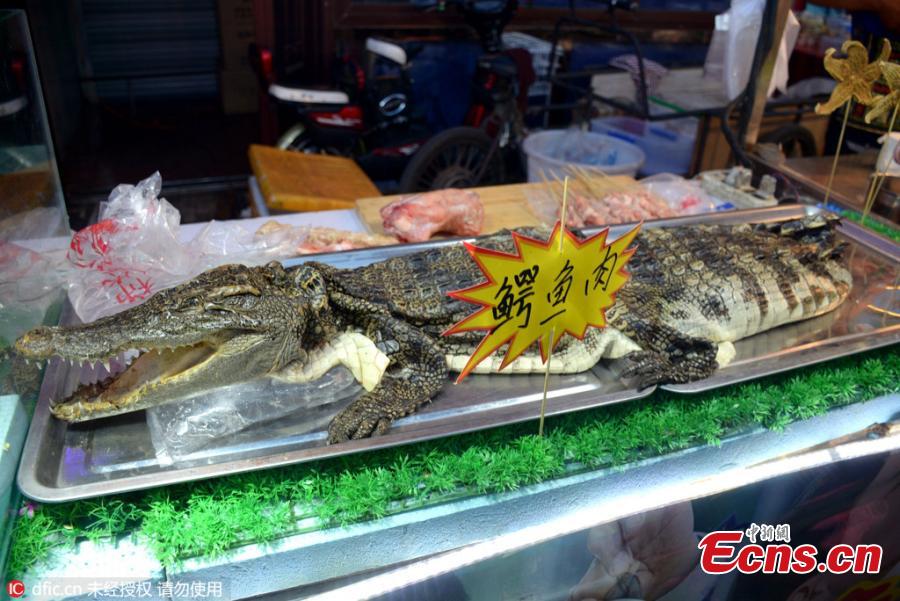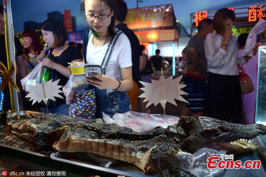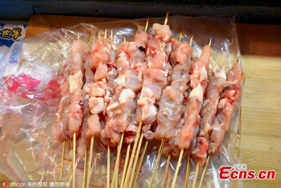 Crocodile meat is for sale at a BBQ booth in Shenyang City, the capital of Northeast China’s Liaoning Province, June 13, 2016. One skewer costs 20 yuan ($3.1). (Photo/IC)