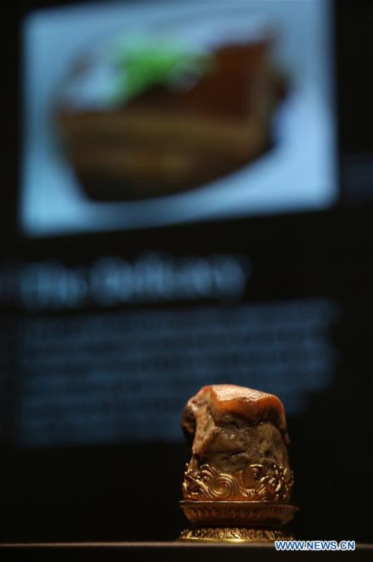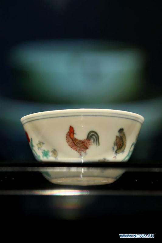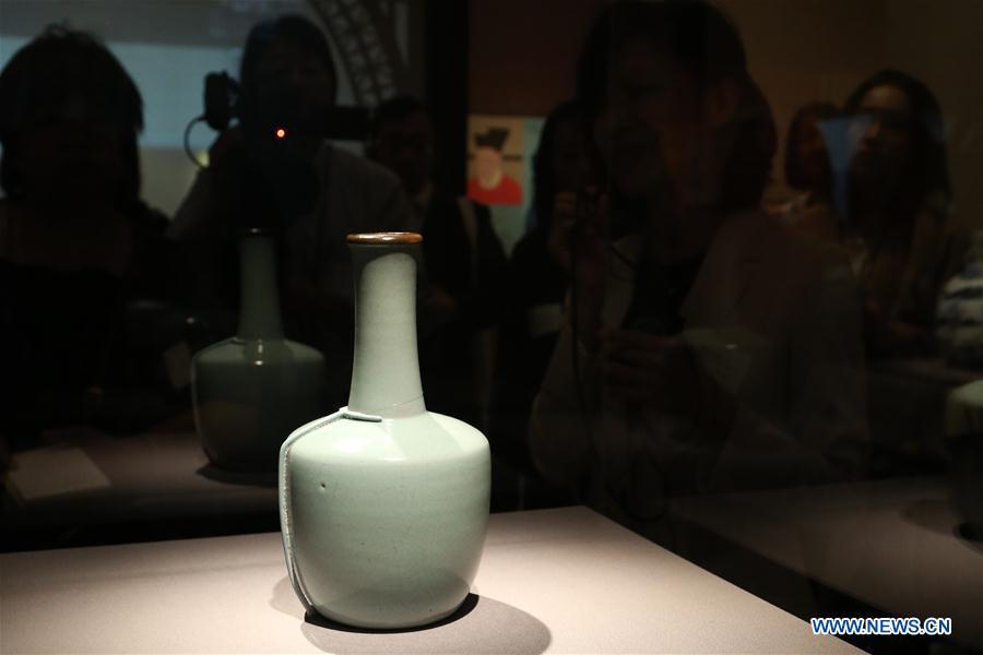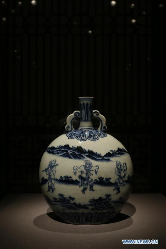 Photo taken on June 15, 2016 shows one of the only two surviving Ming dynasty blue-and-white flat vases which depicts West Asian entertainers displayed in the Asian Art Museum of San Francisco, the United States. The Asian Art Museum of San Francisco put on a media preview of its exhibition "Emperors' Treasures: Chinese Art From Taipei Palace Museum" on Wednesday. The exhibition will present about 150 imperial artworks spanning the Song dynasty in the early 12th century to the Qing dynasty in the early 20th century between June 17 to September 18, 2016, with most of the pieces appearing for the first time in America. (Photo/Xinhua)