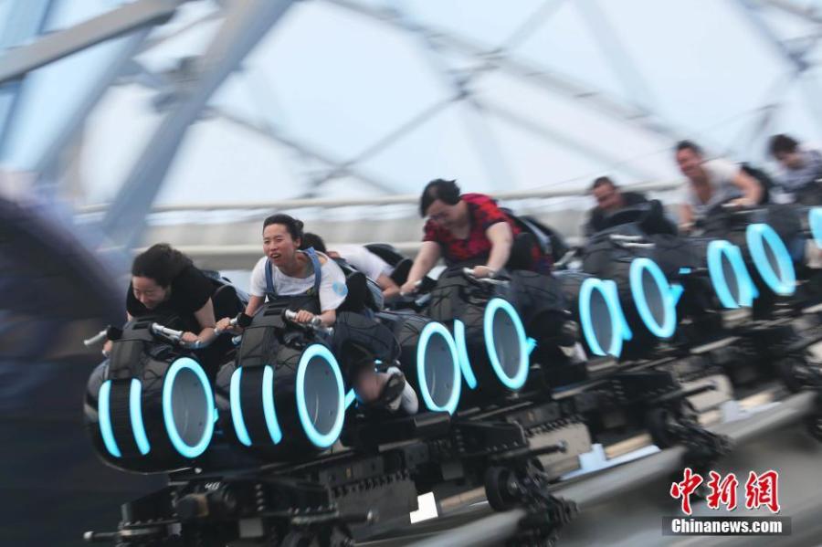 Visitors experience the TRON Lightcycle Power Run ride at Shanghai Disney Resort on its official opening day, June 16, 2016. The ride is part roller coaster and part simulator, employing elements of the classic 1982 science fiction film "Tron" and its 2010 sequel, "Tron: Legacy". The thrilling ride blends ground-breaking computer animation and brilliant visual effects. It is one of the fastest indoor roller coasters in Disney theme park history. (Photo: China News Service/Zhang Hengwei)