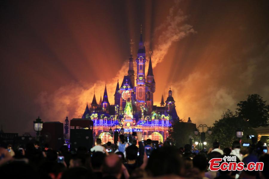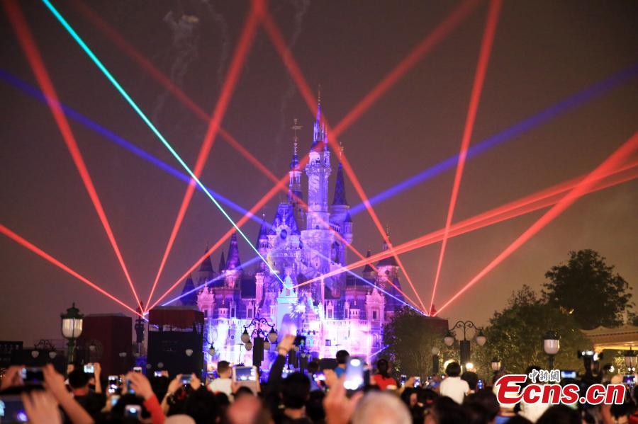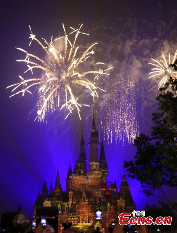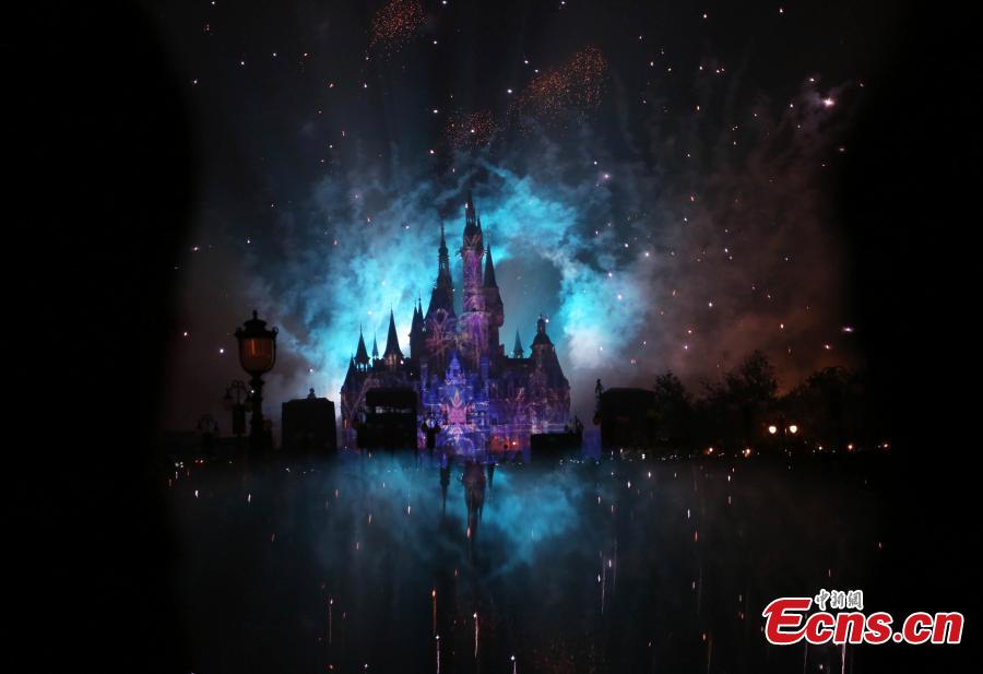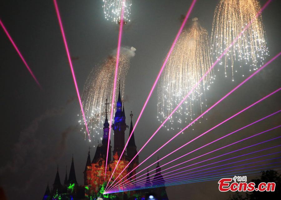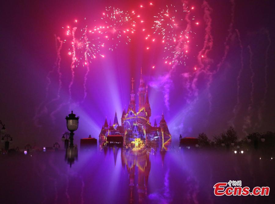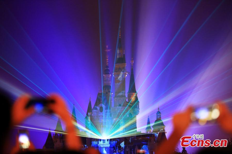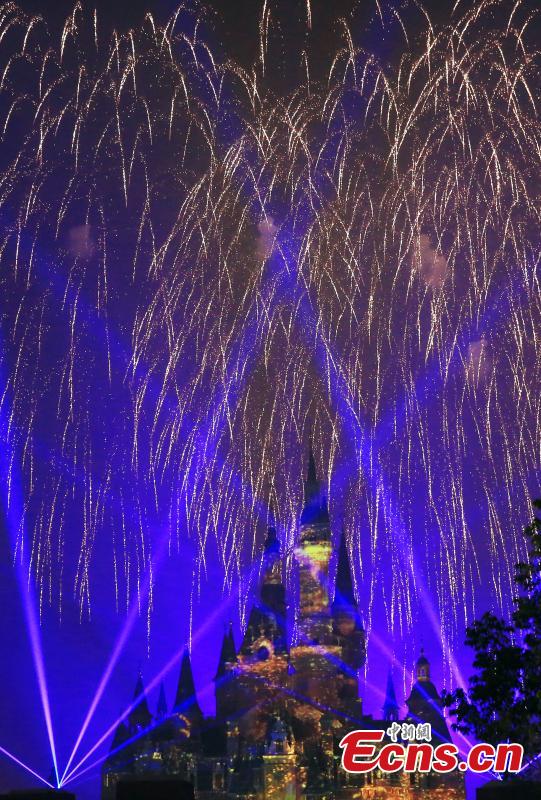 The “Disneyland Forever” show illuminates Shanghai Disney Resort, June 16, 2016. The theme park, with its unique blend of Disney magic and Chinese culture, officially opened Thursday. The fireworks and light shows featured sparkling pyrotechnics, immersive projections, and other enthralling effects. (Photo: China News Service/Zhang Hengwei)
