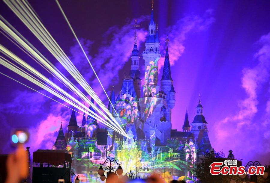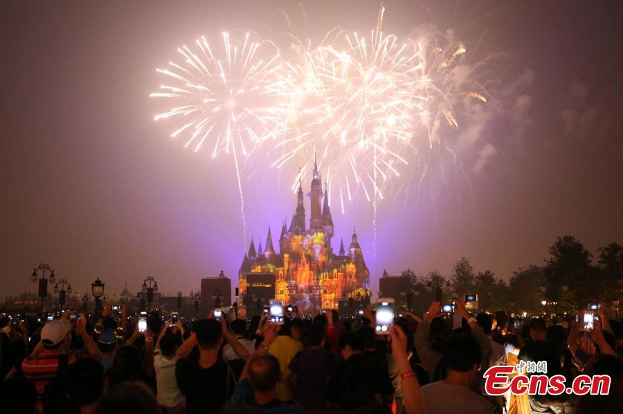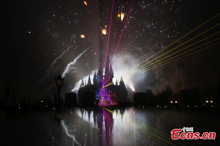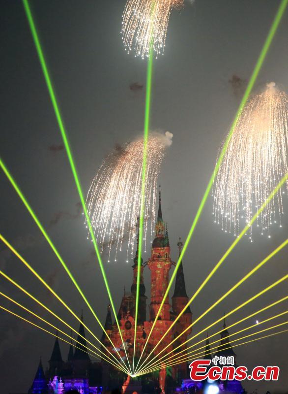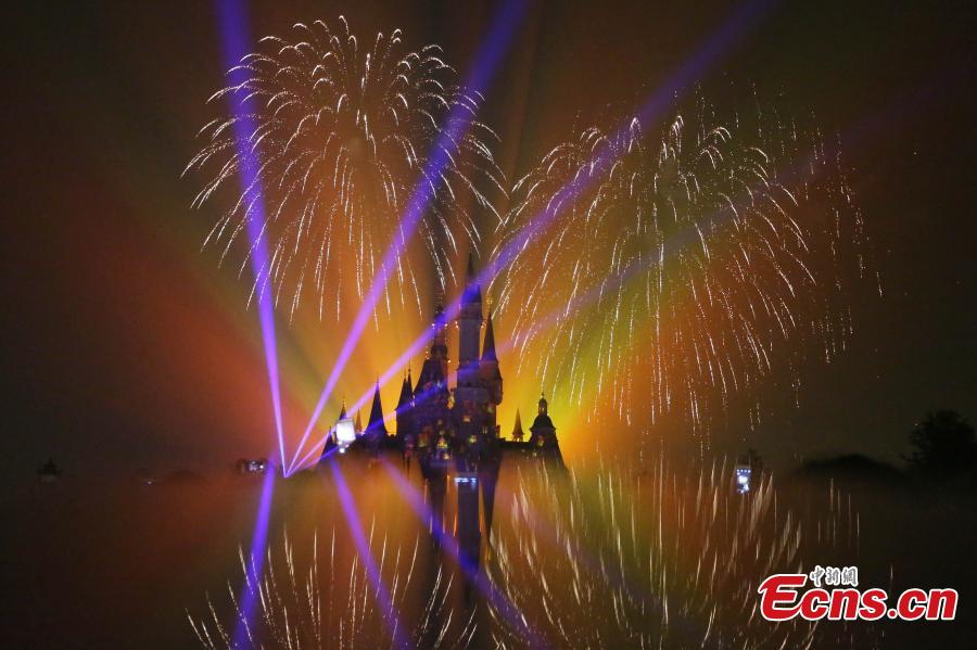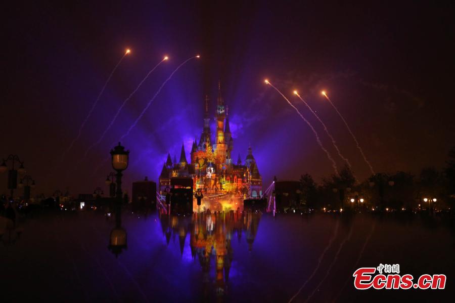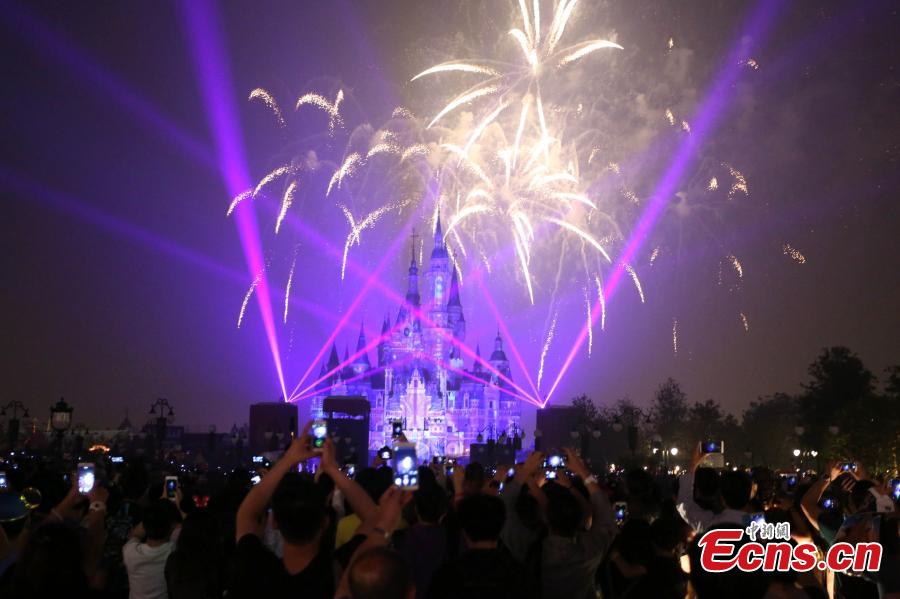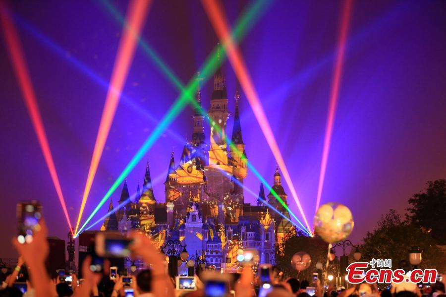 The “Disneyland Forever” show illuminates Shanghai Disney Resort, June 16, 2016. The theme park, with its unique blend of Disney magic and Chinese culture, officially opened Thursday. The fireworks and light shows featured sparkling pyrotechnics, immersive projections, and other enthralling effects. (Photo: China News Service/Zhang Hengwei)