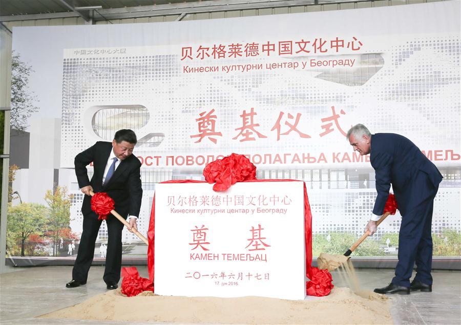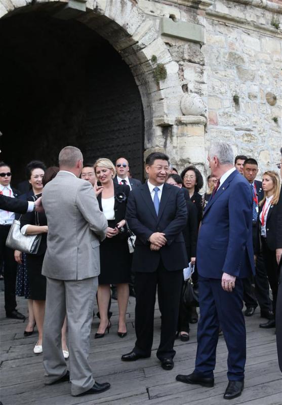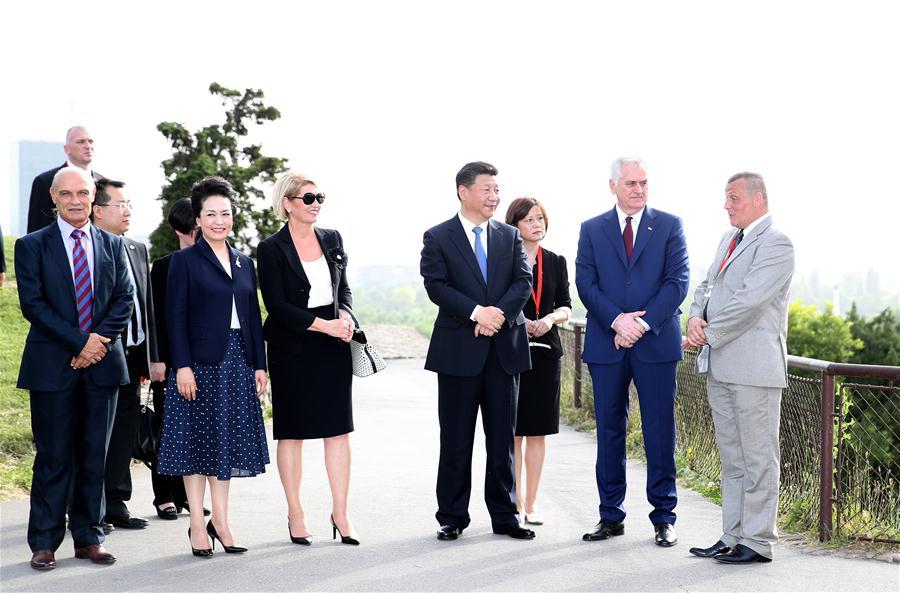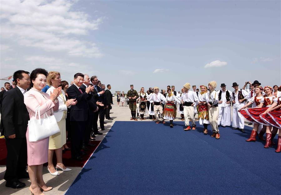 Chinese President Xi Jinping and his wife Peng Liyuan are greeted by Serbian President Tomislav Nikolic and his wife upon their arrival at the airport of Belgrade, Serbia, June 17, 2016. Xi started a state visit to Serbia Friday. (Photo/Xinhua)