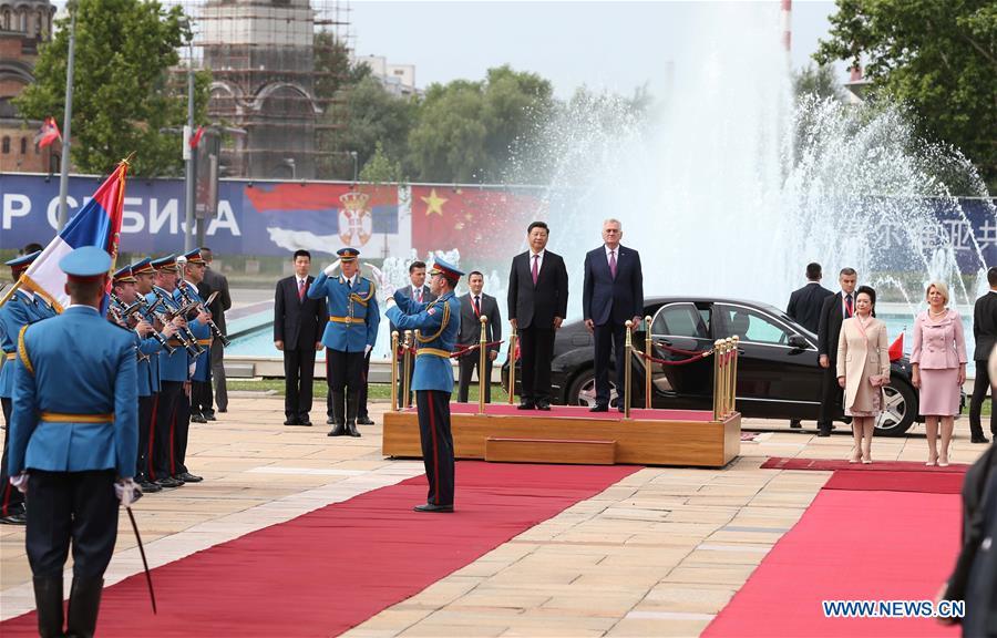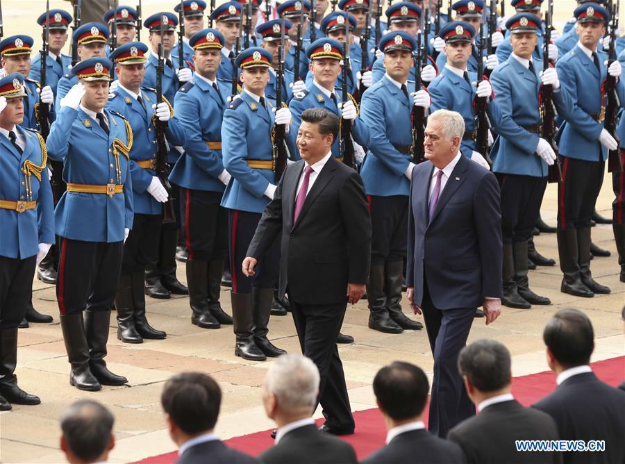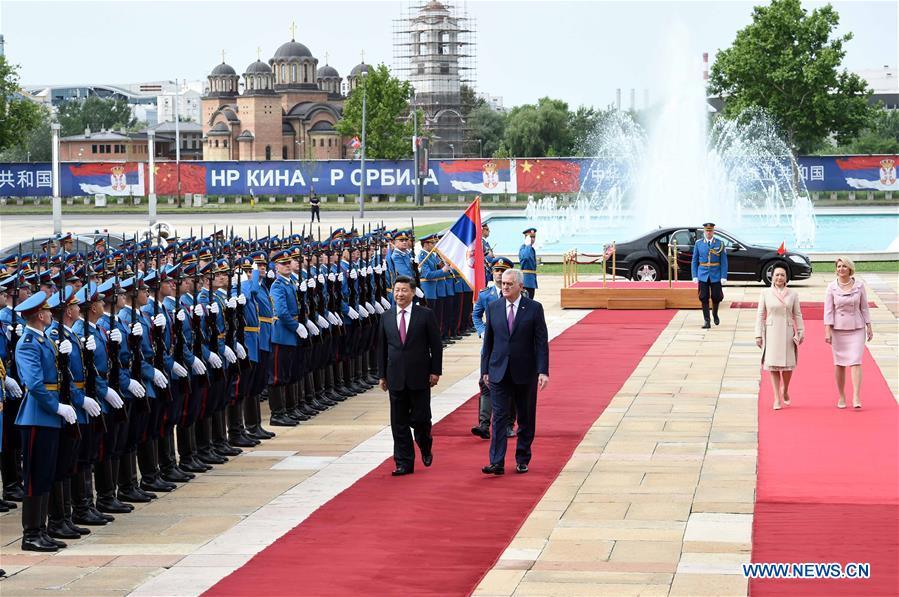 Chinese President Xi Jinping (L, front) attends a welcoming ceremony held by Serbian President Tomislav Nikolic in Belgrade, Serbia, June 18, 2016. (Xinhua/Ma Zhancheng)