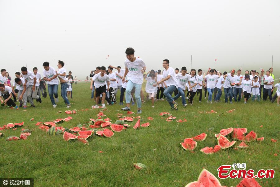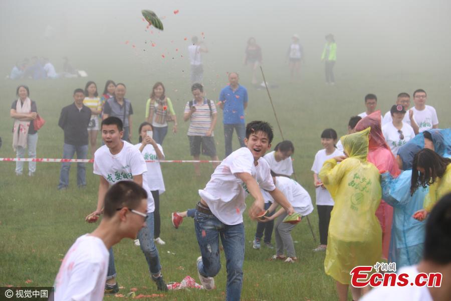 High school graduates, who have recently finished the high-stake national college entrance exams, known as gaokao, take part in a watermelon fight at the Xiannv Mountain national forest park in Wulong County, Southwest China’s Chongqing Municipality, June 18, 2016. (Photo/CFP)