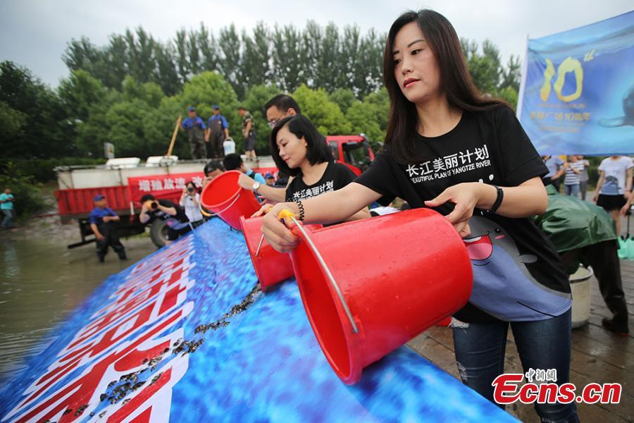 Fish fries are released into the Yangtze River in Nanjing City, the capital of East China’s Jiangsu Province, June 21, 2016. Nearly 100 residents released about one million fries of several species of fish into the river during the event, organized to promote the protection of endangered animals. (Photo: China News Service/Yang Bo)