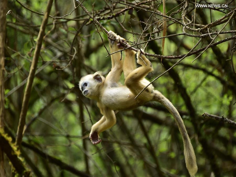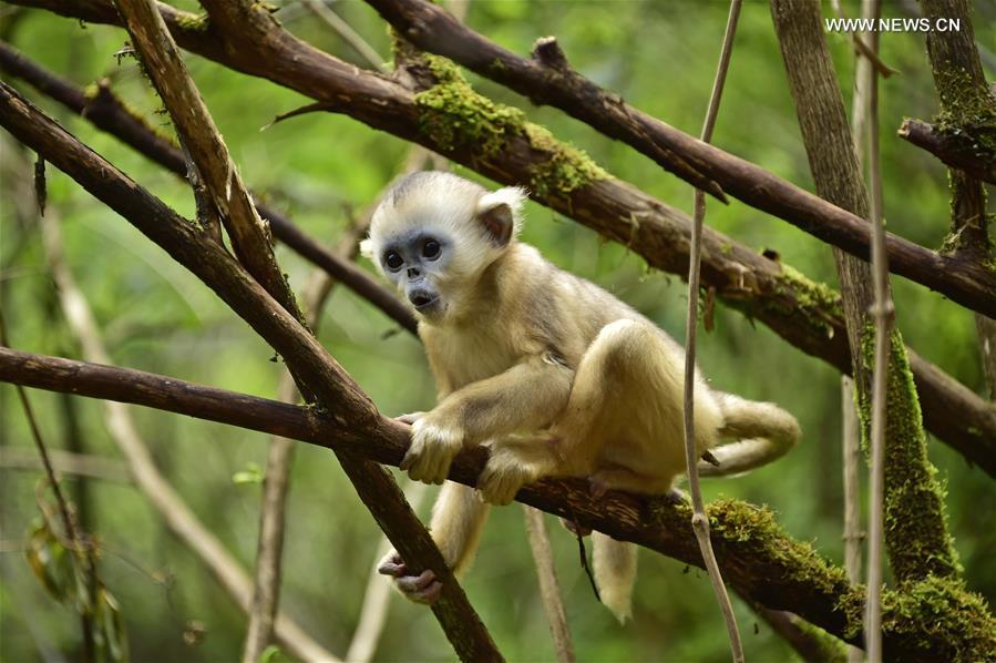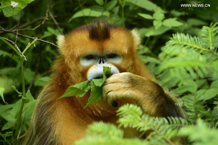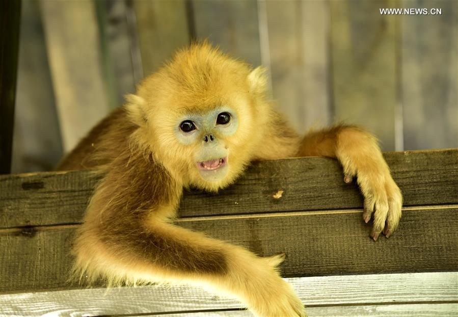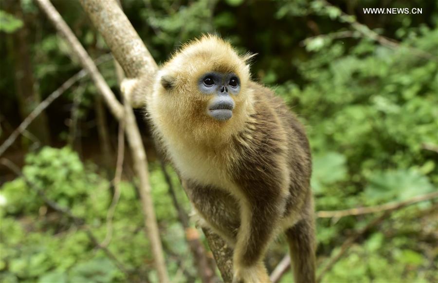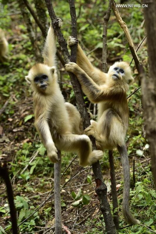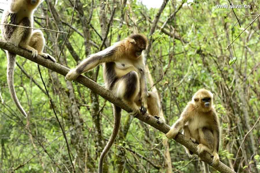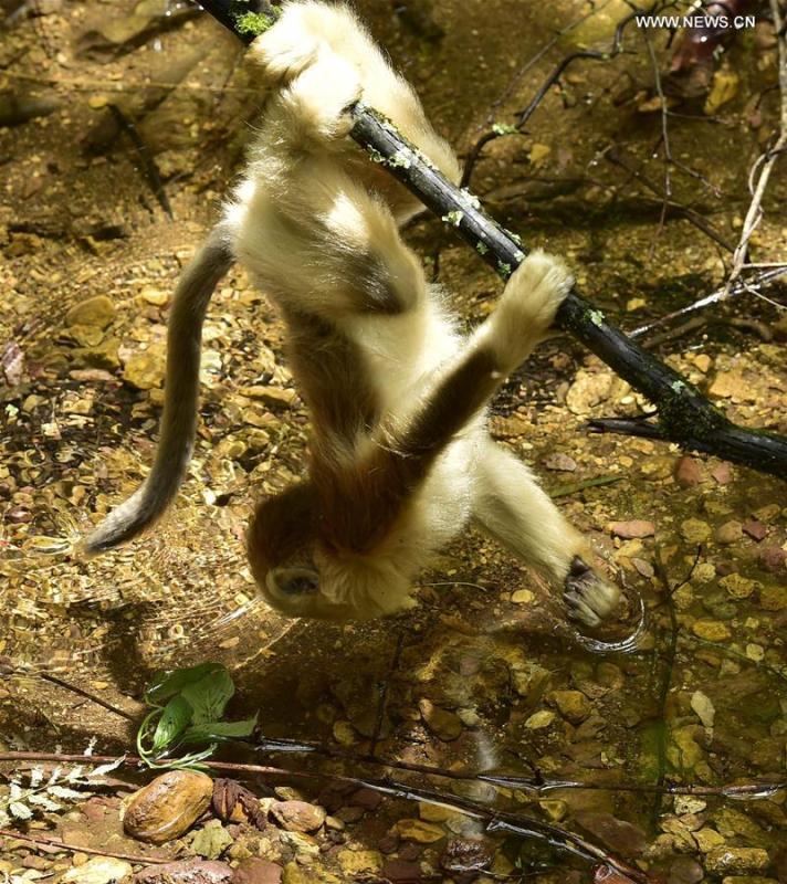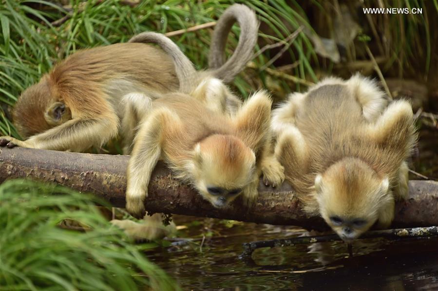 Golden monkeys drink water at the Dalongtan Golden Monkey Research Base in Shennongjia, central China's Hubei Province, June 21, 2016. The number of golden monkeys in Shennongjia has doubled since the 1980s. (Photo/Xinhua)