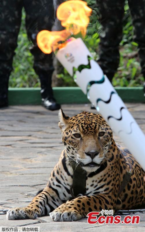 The Olympic Torch, hold by an athlete, is seen by a jaguar --symbol of Amazonia-- during a ceremony in Manaus, northern Brazil, on June 20, 2016.