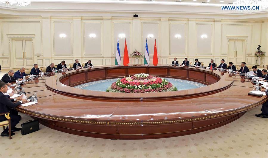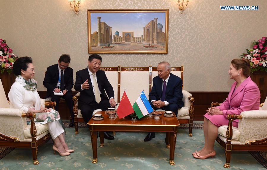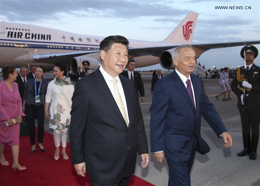 Chinese President Xi Jinping (L,front) and his wife Peng Liyuan are greeted by Uzbek President Islam Karimov (R,front) and his wife Tatyana Karimova upon their arrival at the airport in Tashkent, Uzbekistan, June 21, 2016. The Chinese president is in Uzbekistan for a state visit. He will also attend the 16th meeting of the Shanghai Cooperation Organization Council of Heads of State on June 23 and 24. (Photo/Xinhua)
