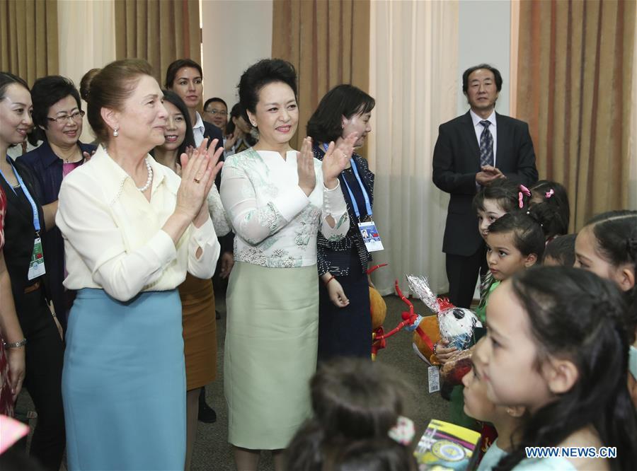 Peng Liyuan (C), wife of Chinese President Xi Jinping, and Tatyana Karimova (R), wife of Uzbek President Islam Karimov, visits the library at the Confucius Institute in Tashkent, Uzbekistan, June 22, 2016. (Photo/Xinhua)