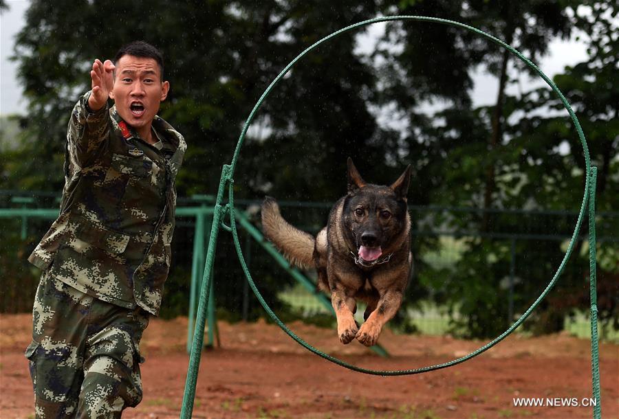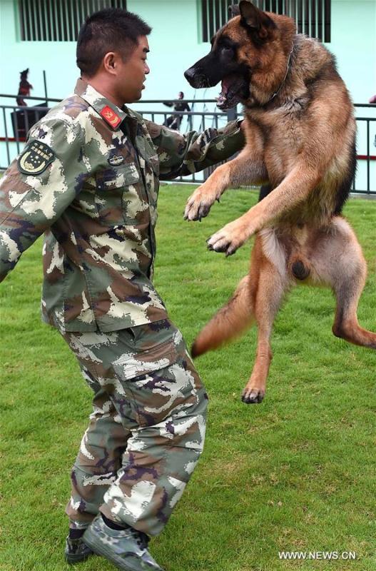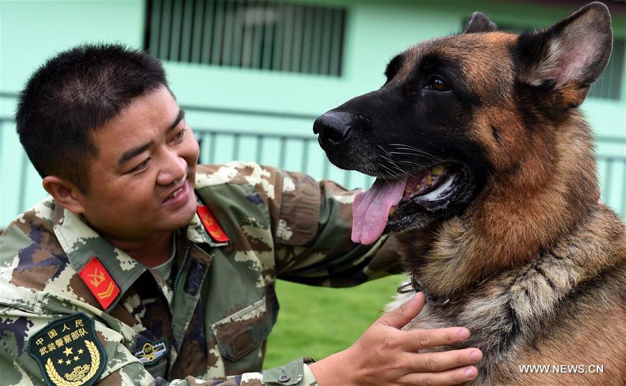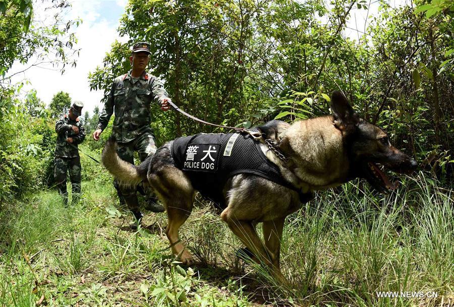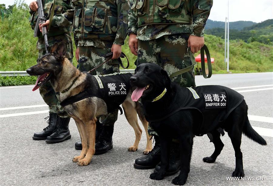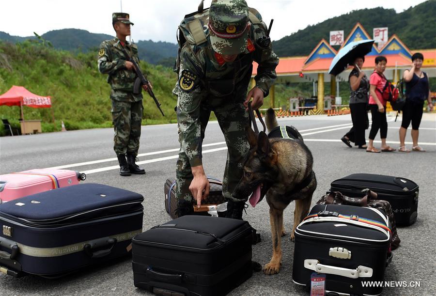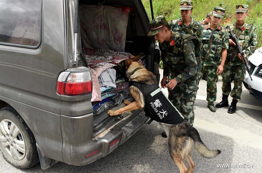 Sniffer dog "Chuge" inspects passenger baggages along a road in Ruili City of Dehong Dai and Jingpo Autonomous Prefecture, southwest China's Yunnan Province, June 22, 2016. Jiangqiao Police Dog Training Base, which is responsible for sniffer dog training and frontier inspection, has more than 20 sniffer dogs in service currently. Since the base was established in 2003, dogs here have helped crack over 820 drug cases. (Photo/Xinhua)