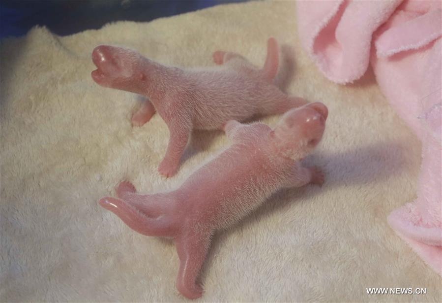 Photo taken on June 23, 2016 shows a pigeon pair of panda cubs at Chengdu Research Base of Giant Panda Breeding in Chengdu, capital of southwest China's Sichuan Province, June 23, 2016. A female panda called Xingya gave birth to the first pigeon pair this year on Thursday in southwest China's Sichuan Province, the Chengdu Research Base of Giant Panda Breeding said on Thursday. Xingya gave birth to a male cub weighing 170 grams at 1:17 p.m. and a female cub weighing 161 grams at 1:30 p.m. (Xinhua)