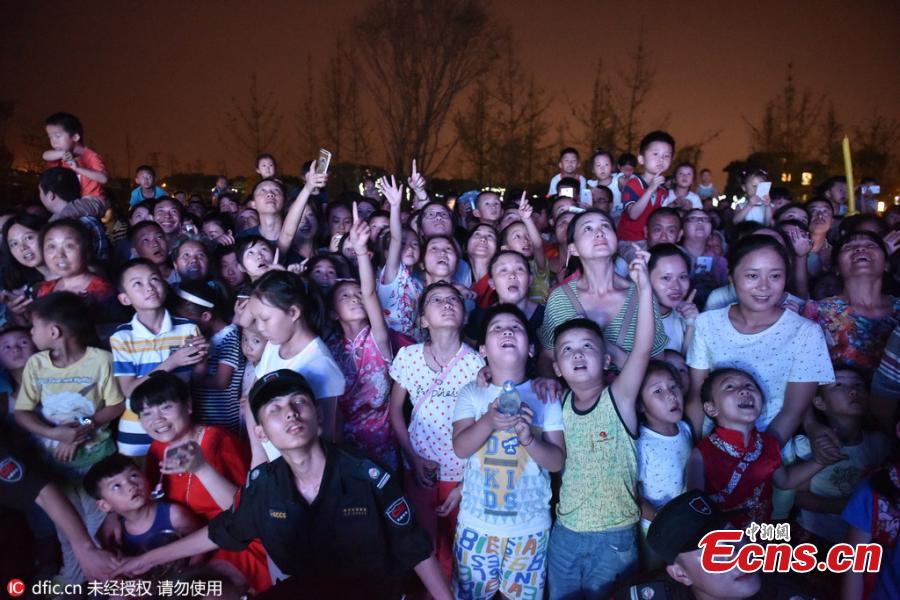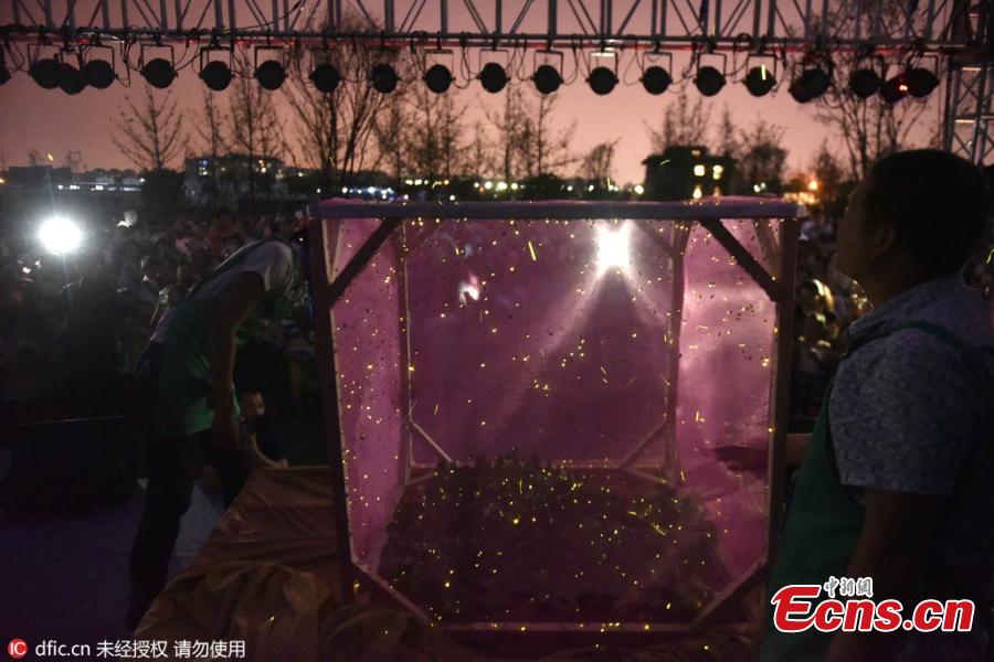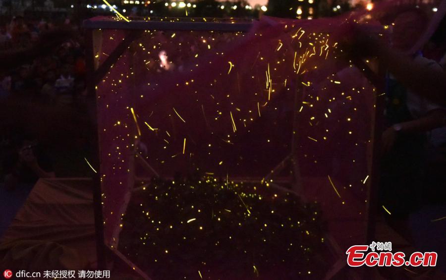Fireflies are released into the air at a nighttime event in Chengdu City, the capital of Southwest China’s Sichuan Province, June 25, 2016. Organizers said about 100,000 fireflies were set free in the event that attracted a large number of visitors. But Zhao Li, curator of the Insect Museum of West China, was strongly against the activity, noting they will all die in three days to a week because the insects have high environmental requirements to survive. (Photo/IC)