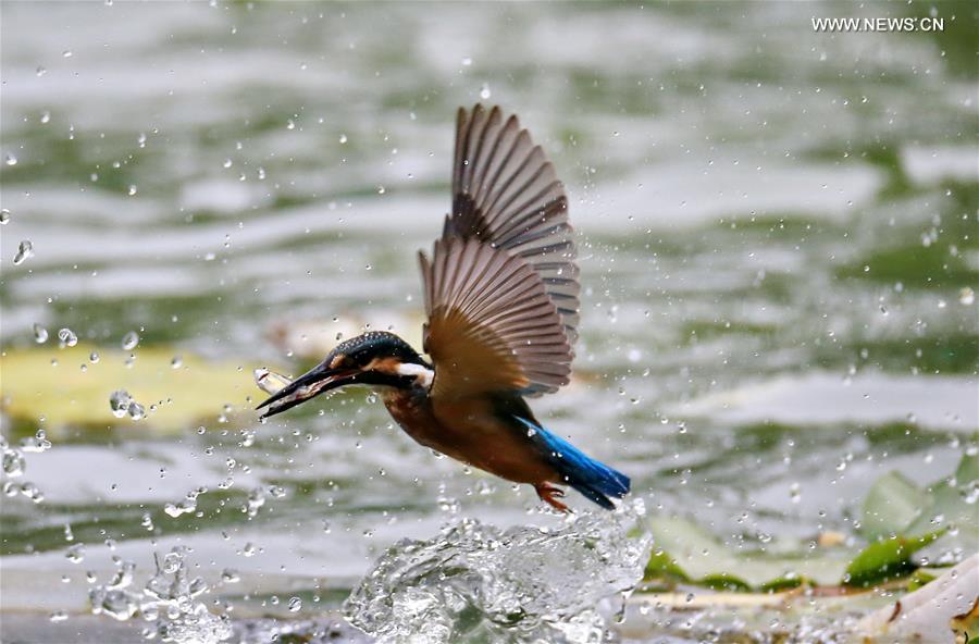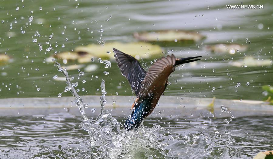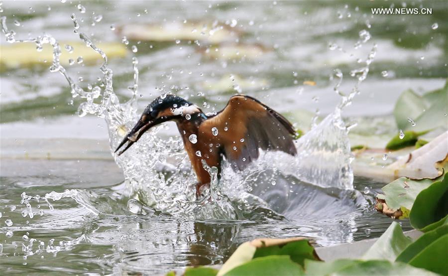 A kingfisher catches a fish in the Niukouyu water reservoir in Beijing, capital of China, June 26, 2016. (Xinhua/Liu Xianguo)