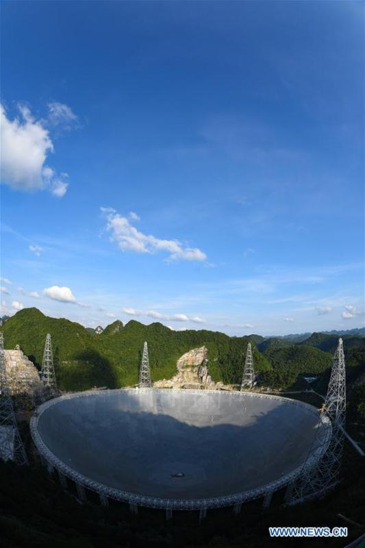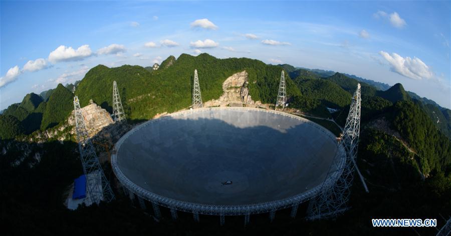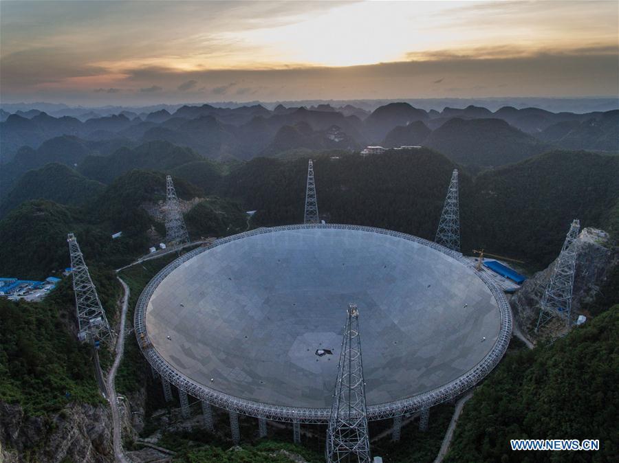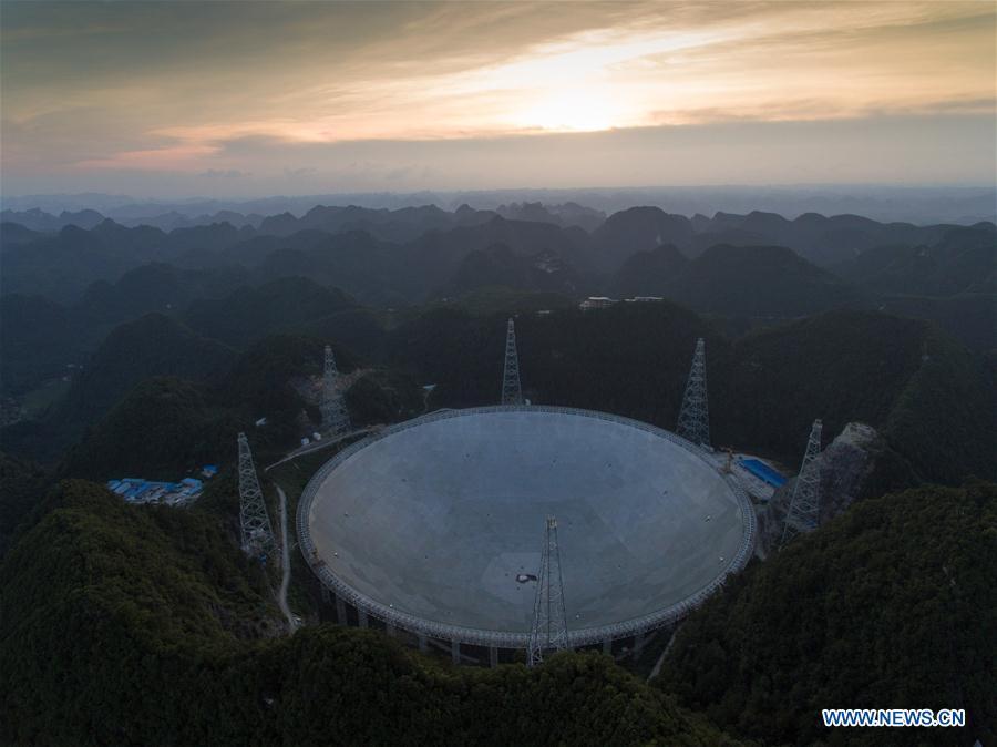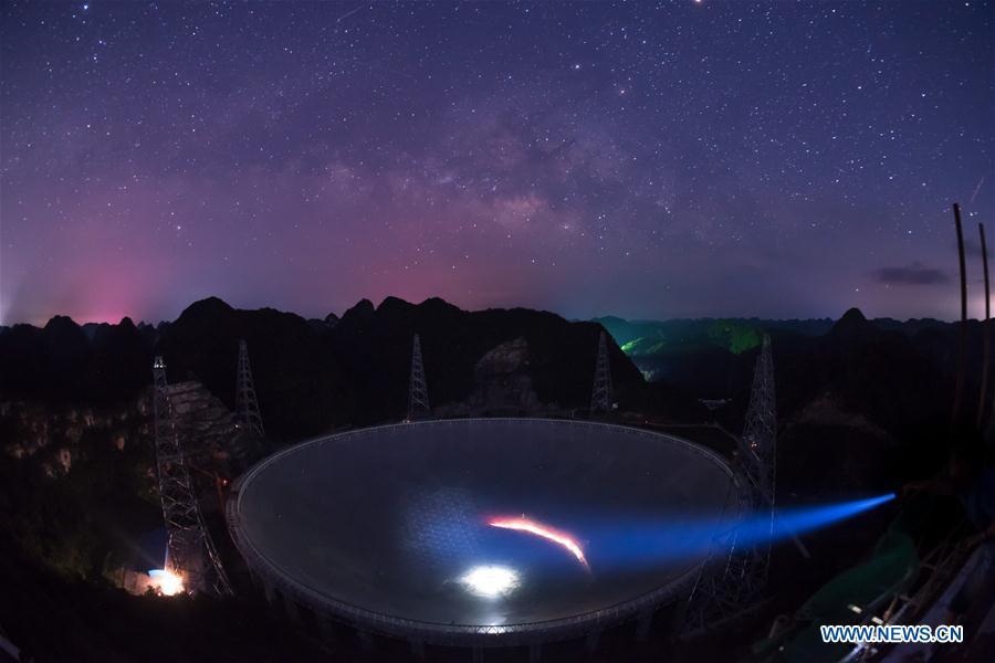 Photo taken on June 27, 2016 shows the Five-hundred-meter Aperture Spherical Telescope, or "FAST," at night in Pingtang County, southwest China's Guizhou Province. Construction of the world's largest telescope FAST started in March 2011. The telescope will be used to detect and collect signals and data from the universe. (Xinhua/Liu Xu)