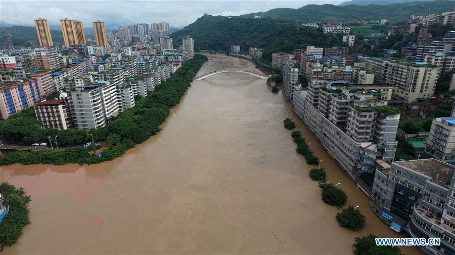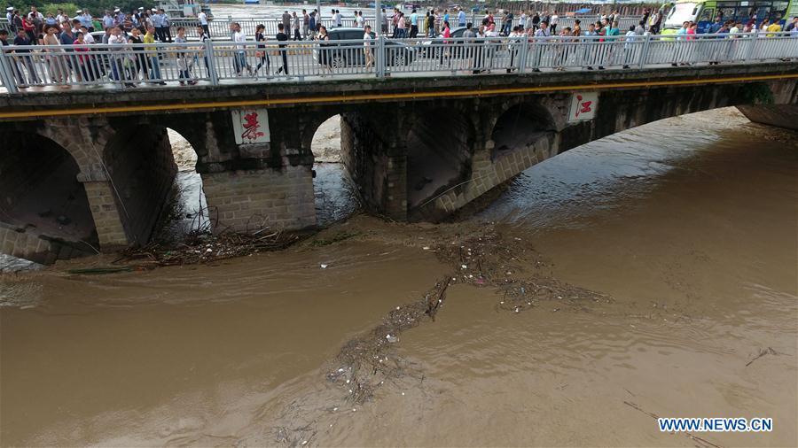 Photo taken on June 28, 2016 shows part of a bridge being flooded in Qijiang District of Chongqing, southwest China. Torrential rain hit Qijiang District from night of Monday to noon on Tuesday, which caused a leap of water level to 224.7 meters, two meters higher than the safety level. (Photo/Xinhu)