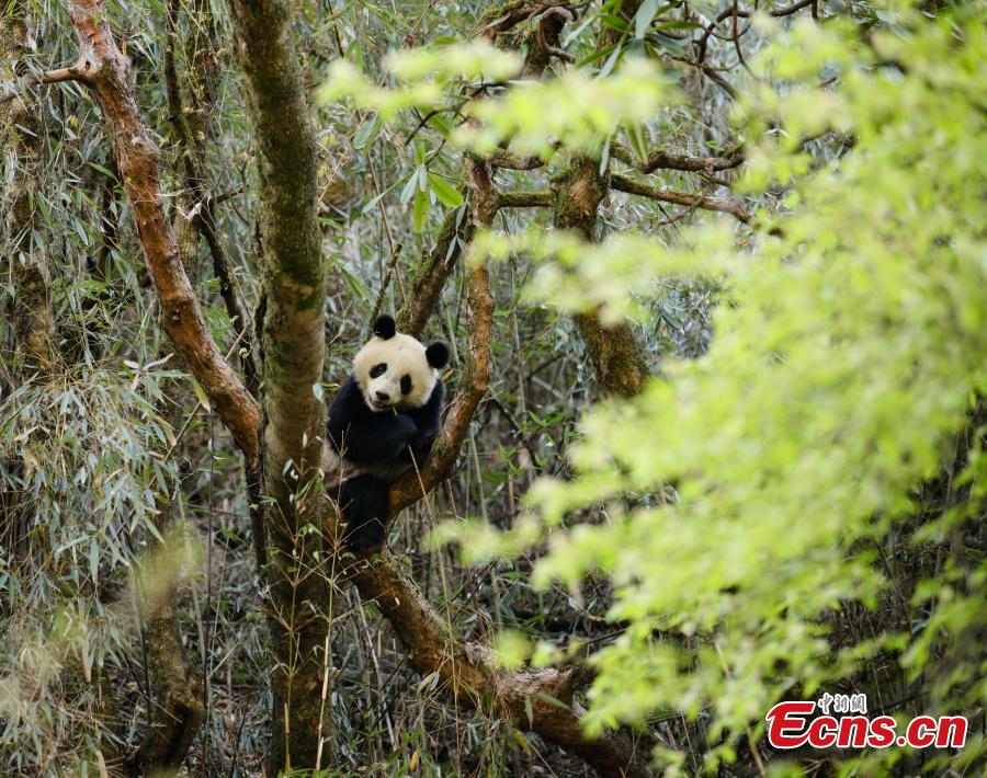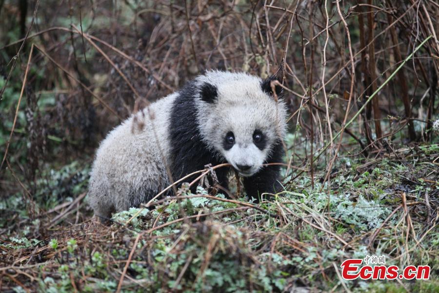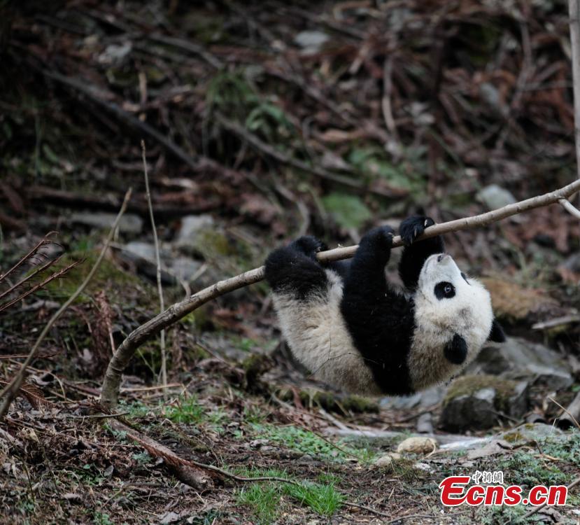 A giant panda plays at a field training area at the China Conservation and Research Center for the Giant Pandas in Wolong Nature Reserve, Southwest China’s Sichuan Province. Two giant pandas, Hua Yan and Zhang Meng, have had two years of training to prepare them to survive in the wild and will be released back into nature in July. The training included finding food and water on their own, seeking natural hideouts and identification of same species and animals than can pose a threat. (Photo: China News Service/Zhong Xin)