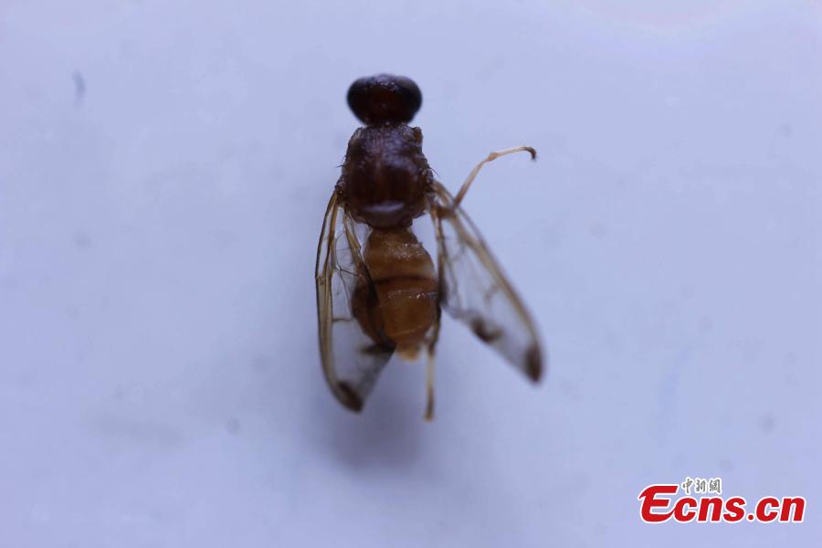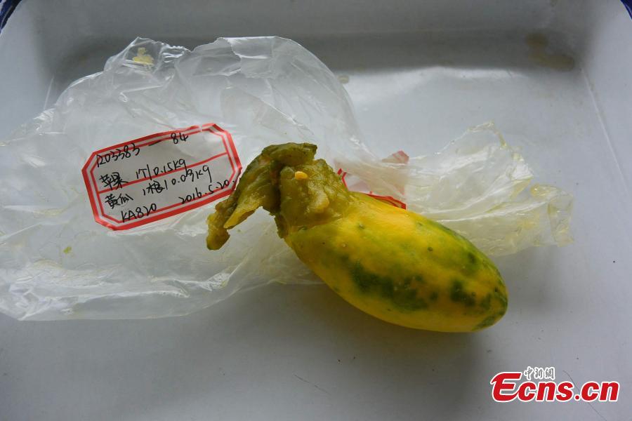 Melon flies are found in cucumbers carried by an airplane passenger traveling from Hong Kong to Chengdu City, the capital of Southwest China’s Sichuan Province, June 29, 2016. Inspection and quarantine officers found the pest, a serious threat to agriculture, during an airport check. The fruit were confiscated and destroyed. The pest has already caused damage in Guangdong, Guangxi, Fujian, Hainan and other regions. (Photo: China News Service/Zhong Xin)