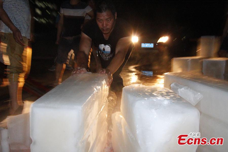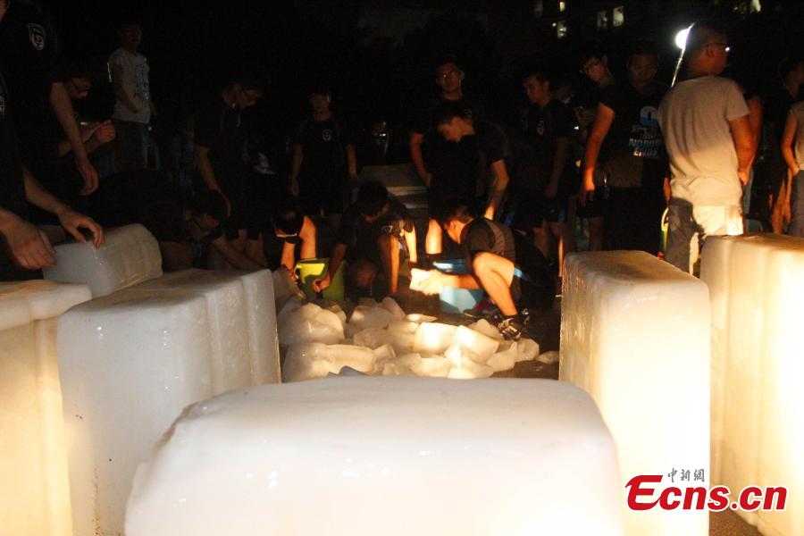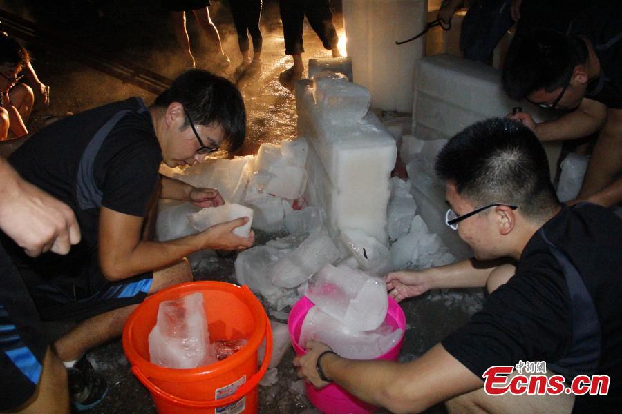 Students play with ice at the Lushan College of Guangxi University of Science and Technology in Liuzhou City, South China’s Guangxi Zhuang Autonomous Region, June 28, 2016. The college handed out 15 tons of ice cubes to students facing sweltering summer heat. (Photo: China News Service/Zhu Liurong)
