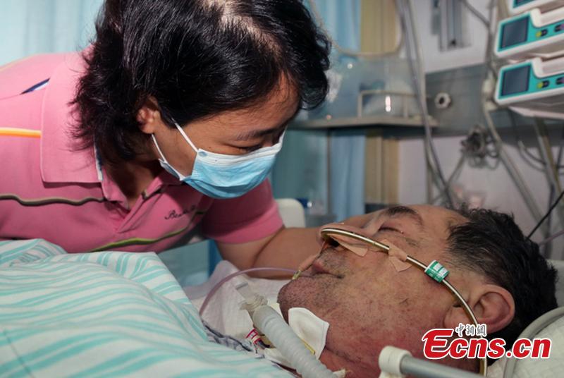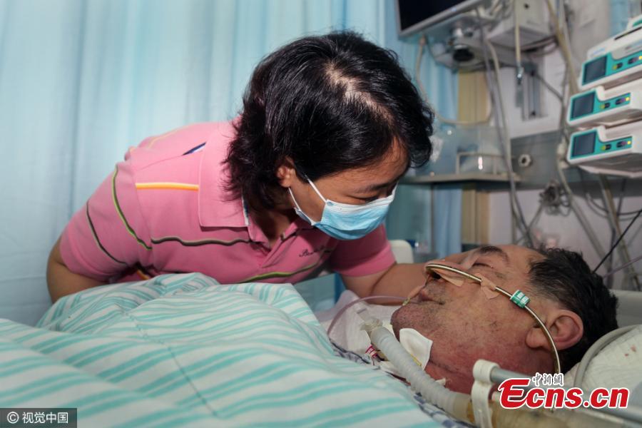 The undated photo shows Mark Terence Osbone and his wife at a hospital. Following a devastating stroke, the British teacher made a decision to live out his limited number of days in China and donate his body organs to benefit six Chinese patients in Hangzhou City, East China’s Zhejiang Province. Mark, 49, and his Chinese wife Wang celebrated their sixth wedding anniversary in an intensive care unit at the Second Affiliated Hospital of Zhejiang University School of Medicine on June 8. (Photo/IC)