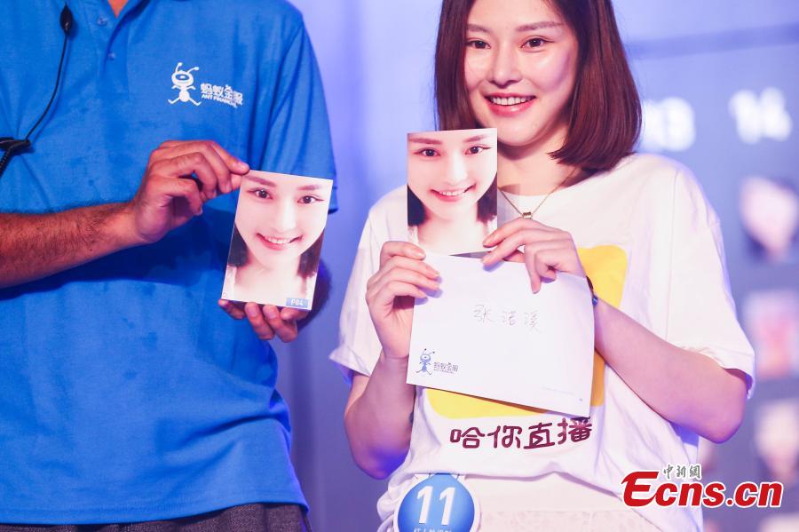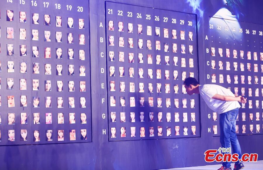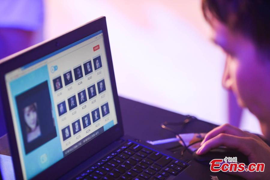 "Water Brother" Wang Yuheng joins a human face recognition contest against a robot Mark, dubbed the "Chinese AlphaGo", in Hanzhou, Zhejiang Province on June 30, 2016. In the contest, the recognition limits of Wang and Mark were challenged as they tried to match 50 popular online beauties, both in person and by using photos. Wang finally beat the robot in the competition. Wang earned his nickname "Water Brother" after successfully telling the difference between 520 glasses of water of the same quality and source during a recent TV show "Super Brain", while Mark was developed by Ant Financial, the Internet finance affiliate of Alibaba Group.(Photo: China News Service/ Xu Kangping)