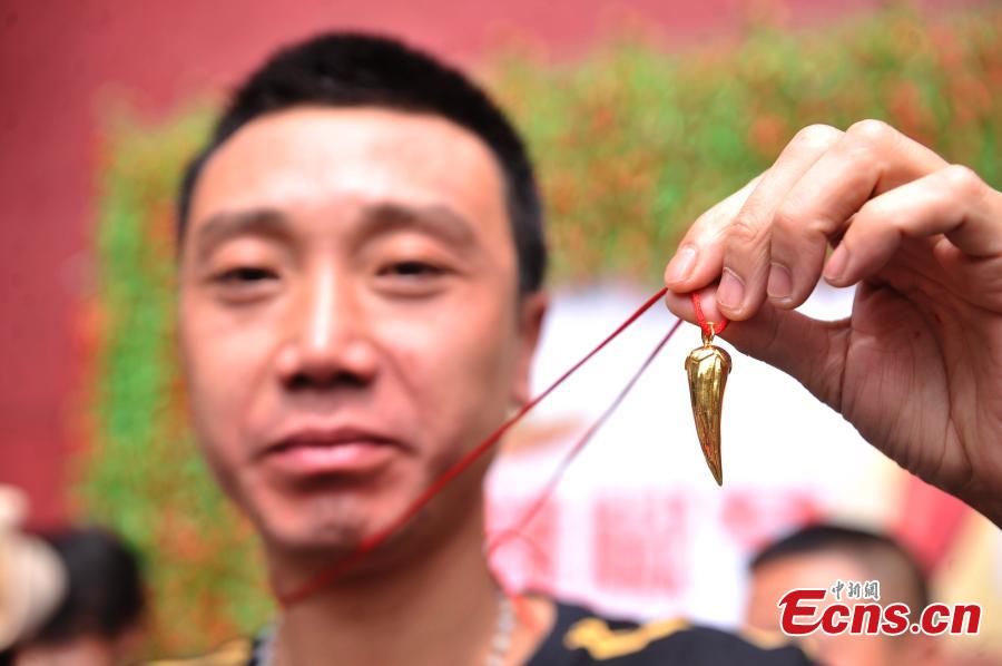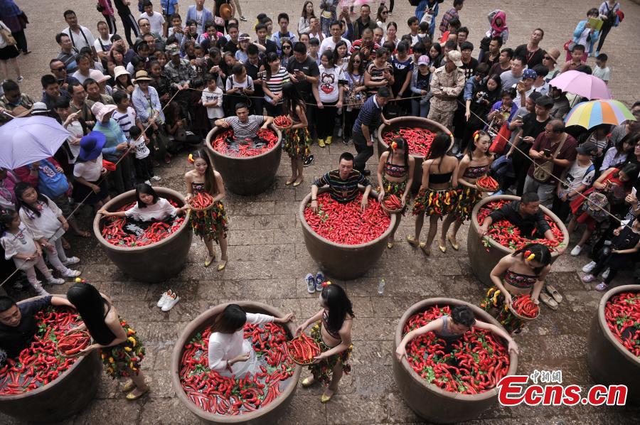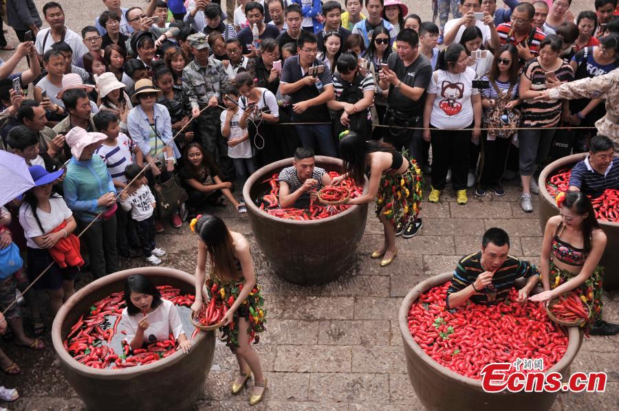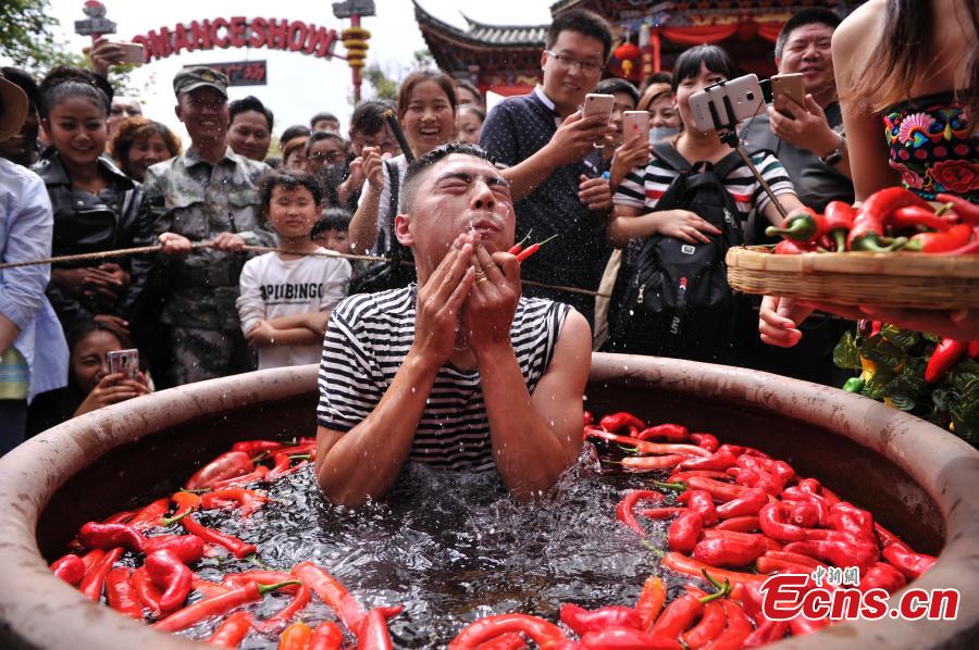 A chili pepper eating competition is being held in Lijiang, Yunnan province on July 2, 2016. Nine contestants who joined the match are asked to eat as many peppers as they can while soaking in a giant tub filled with the hot red chili peppers. The winner was awarded with a 24 karat gold pepper.(Photo: China News Service/Chen Chao)