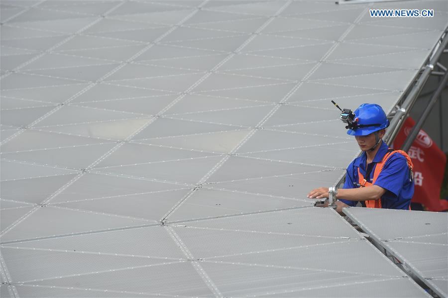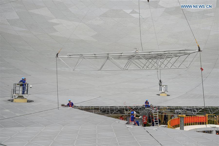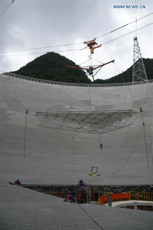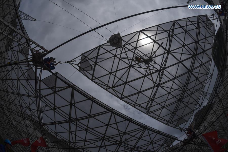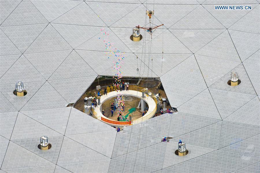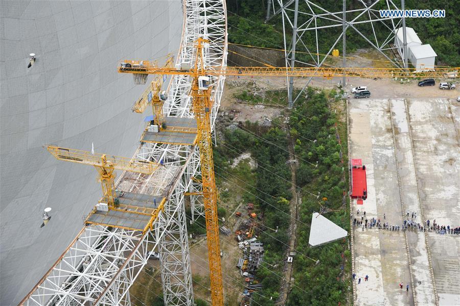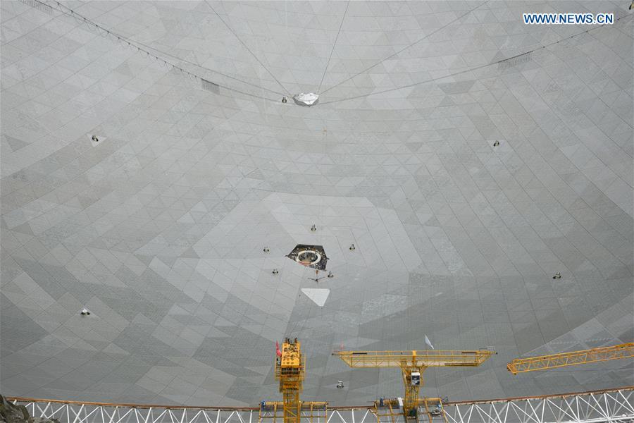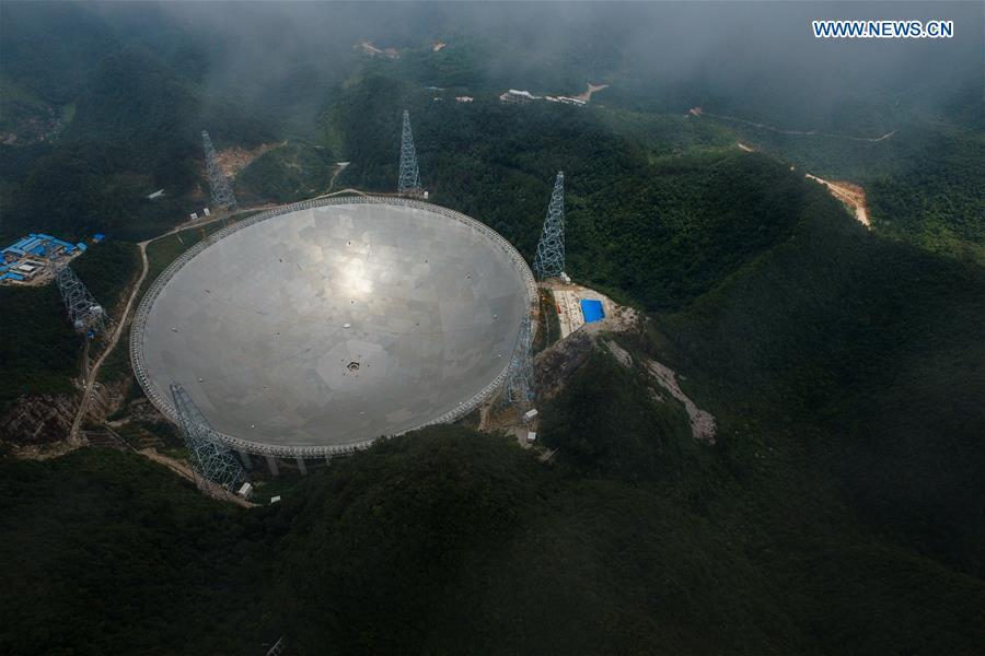 The aerial photo taken on July 3, 2016 shows the Five-hundred-meter Aperture Spherical Telescope (FAST) in Pingtang County, southwest China's Guizhou Province. Installation was completed on the world's largest radio telescope on Sunday morning as the last of 4,450 panels was fitted into the center of the big dish. Scientists will then begin debugging and trial observation of the FAST. (Xinhua/Liu Xu)