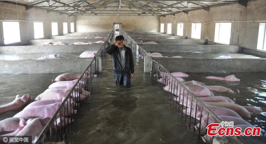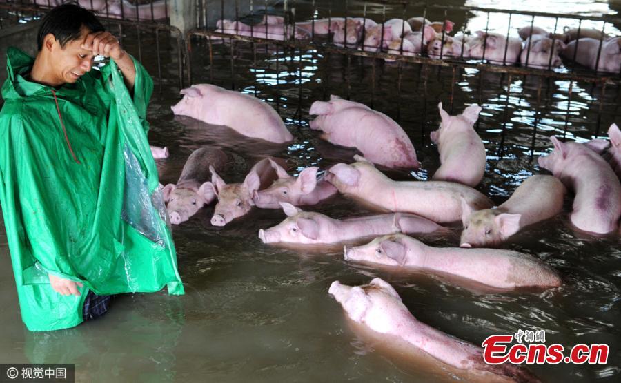 Li Zuming becomes emotional as he sees the pigs he feeds can’t be evacuated from floodwater in Shucheng County, East China’s Anhui Province, July 4, 2016. More than 6,000 pigs were stranded in water for nearly 20 hours at a pig farm and could not be evacuated to a safe place for environmental and quarantine reasons. Li said he felt really helpless but had no other option as a river had burst its banks and submerged several villages after days of rainstorms. (Photo/CFP)