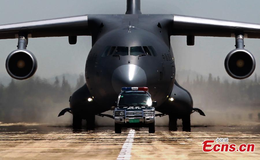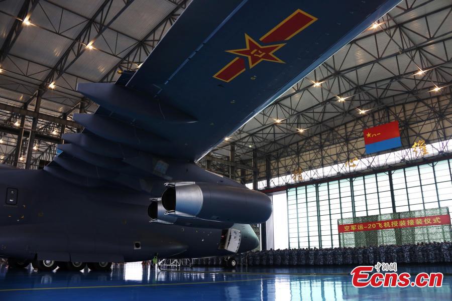 Chen Gang (front), a division commander of the People's Liberation Army (PLA) Air Force, takes the oath during the hand over ceremony of the Y-20, China's homegrown large transport aircraft, in Chengdu, capital of southwest China's Sichuan Province, July 6, 2016. Y-20 officially joined the People's Liberation Army Air Force on Wednesday. (Xinhua/Liu Yinghua)