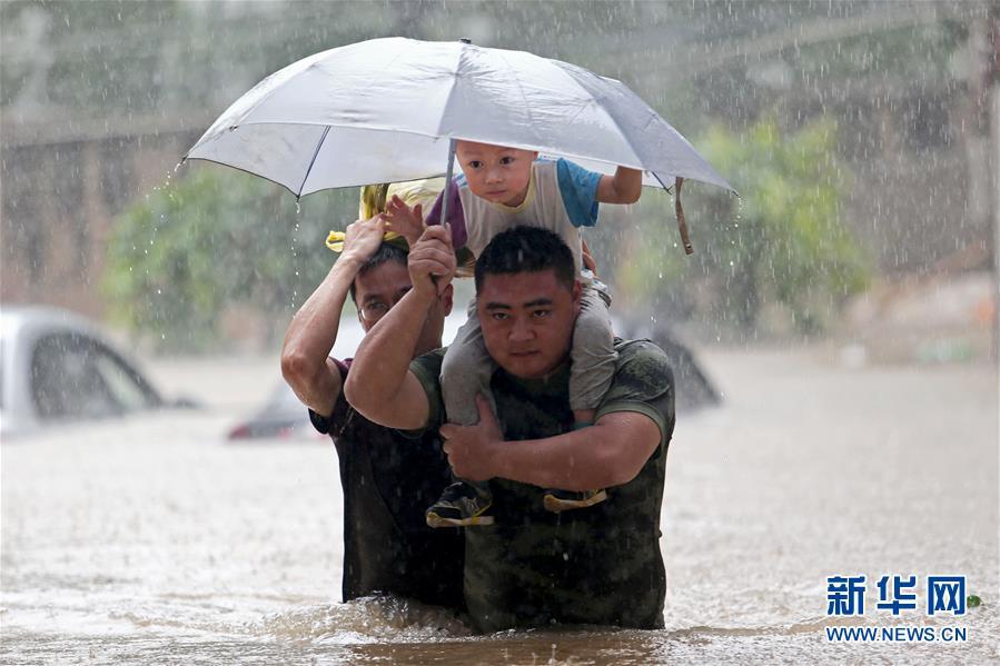 Soldiers rescue an infant besieged by flood waters in Anhui province. Anhui is among the worst-hit provinces by floods. (Photo/Xinhua)