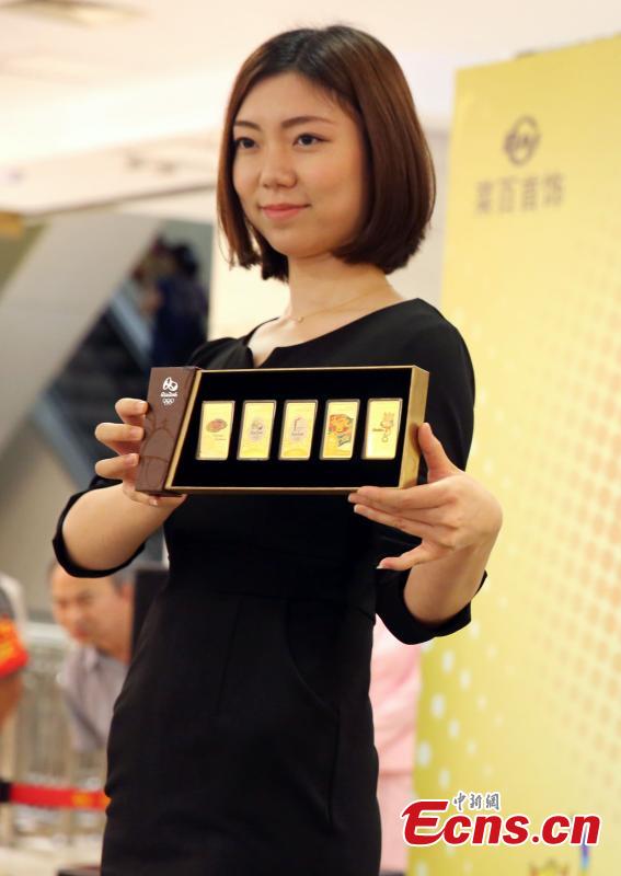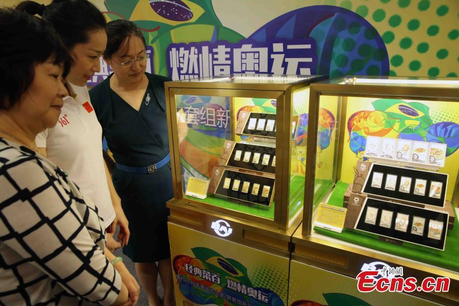 Rio Olympics commemorative gold and silver sets are available on market in Beijing, July 6, 2016. Authorized by the Chinese Olympic Committee and the International Olympic Committee, the two sets include five items each, featuring Olympics elements, such as the mascot and emblem. (Photo: China News Service/Ren Haixia)