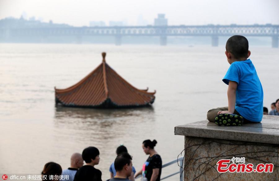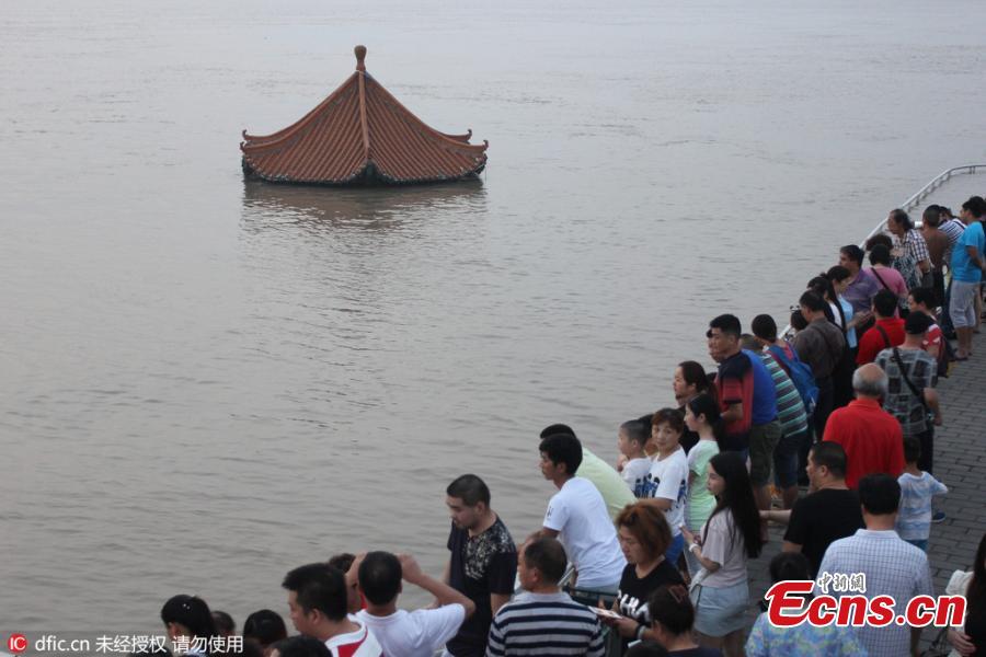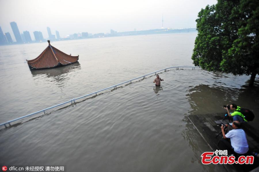 Residents take photo for a viewing pavilion submerged in water in the Huanghuaji area of Wuhan, Central China’s Hubei province on July 7, 2016. (Photo/ CFP)