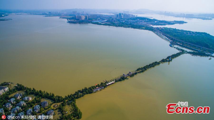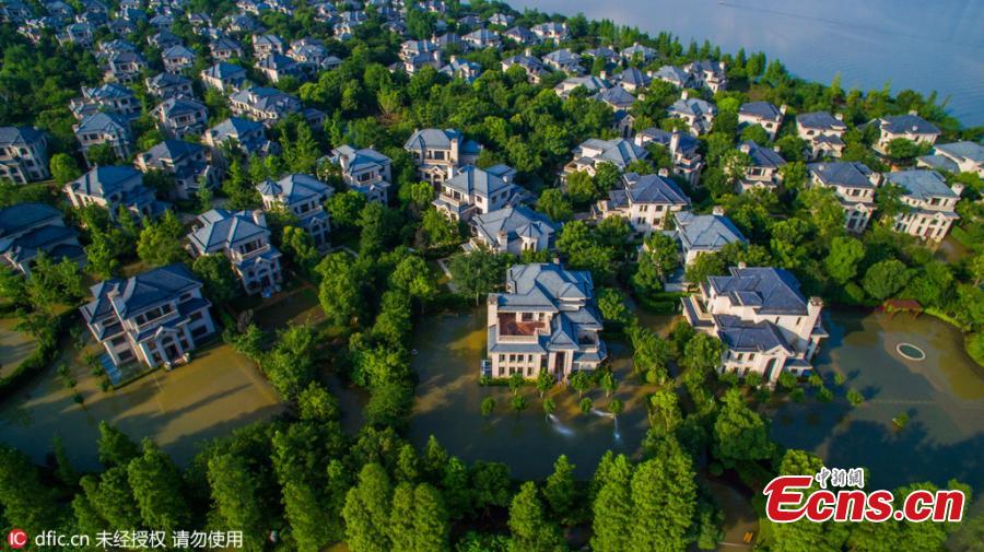 An aerial view of villas flooded in Wuhan city, the capital of Central China’s Hubei Province, July 7, 2016. The only road to the villas at Tangxun Lake was cut by floodwater that left many parts of the city inundated. (Photo/IC)