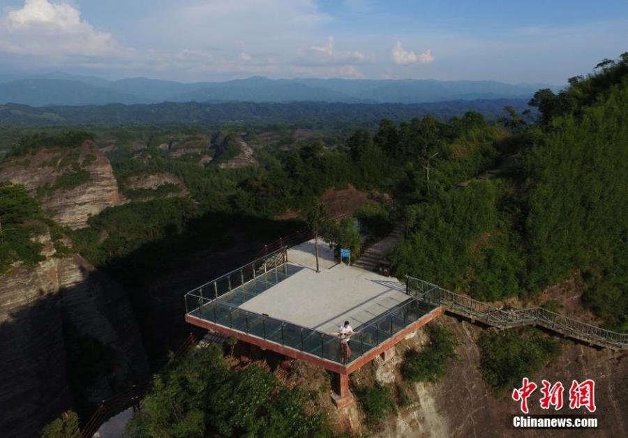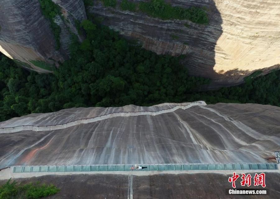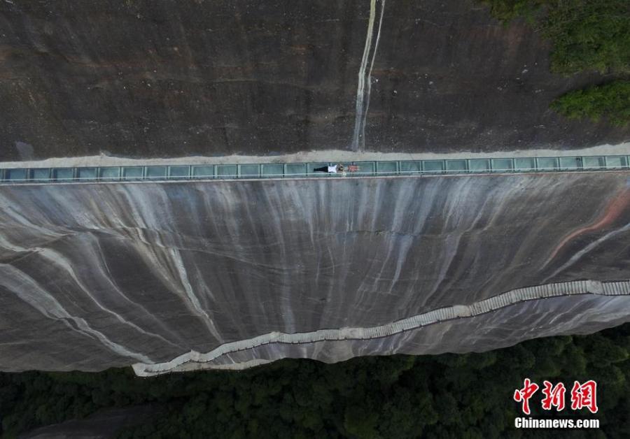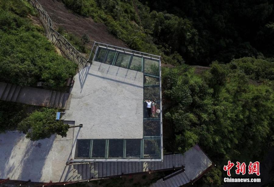 Two visitors lie down on a skywalk glass bridge in central China's Hunan Province, July 8, 2016. The skywalk glass bridge opened to the public on Friday, attracting many tourists to the Wanfo mountain cliff in the province. (Photo: China News Service/Yang Huafeng)