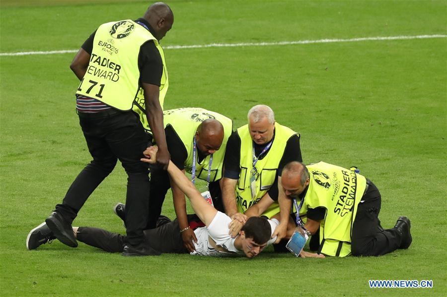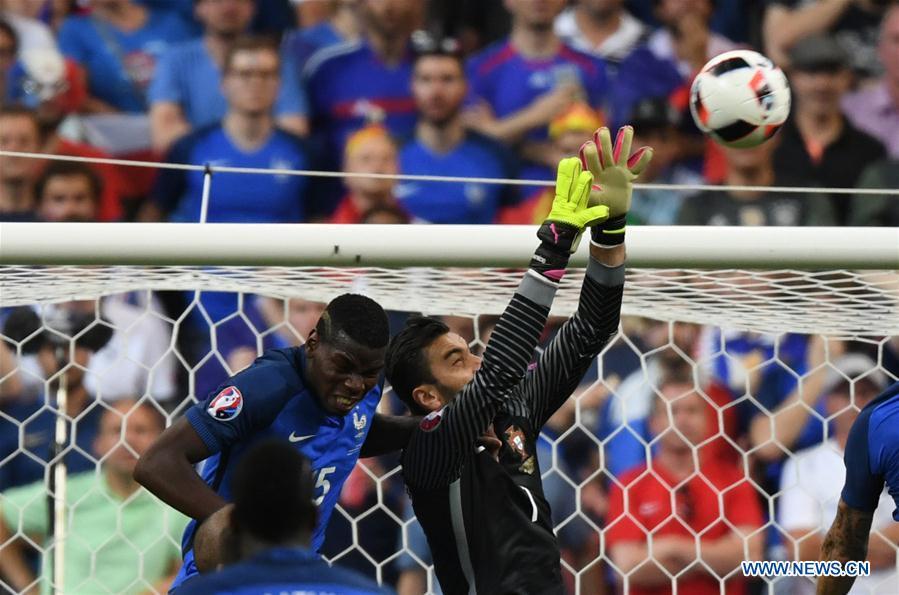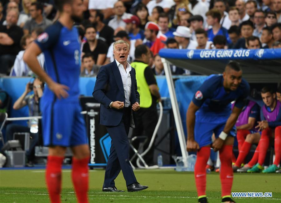 Fernando Santos(C), coach of Portugal celebrates with the trophy during the awarding ceremony after winning the Euro 2016 final football match against France in Paris, France, July 10, 2016. Portugal won 1-0.(Xinhua/Guo Yong)