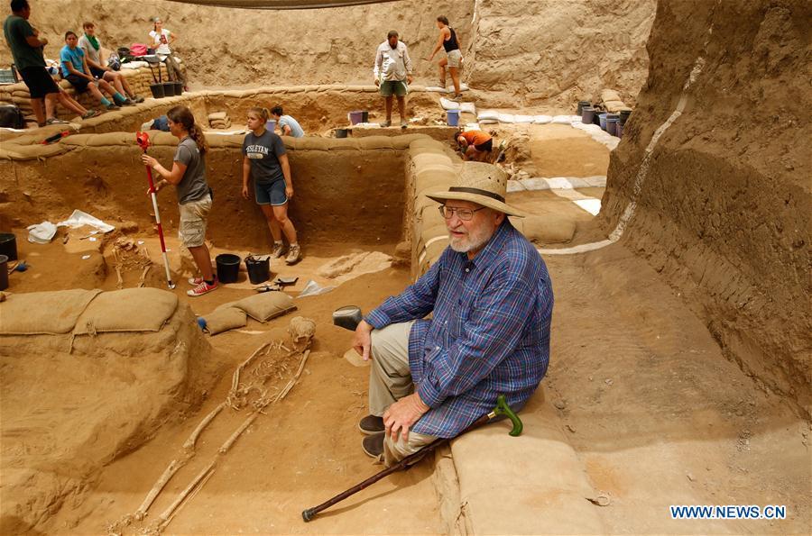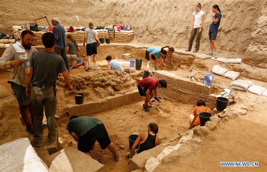 Archaeologists and volunteers work at the archaeological site in the Ashkelon National Park, Israel, on June 28, 2016. Archeologists said on July 10, 2016 they discovered the first Philistine cemetery in Israel's southern Mediterranean shore, hoping the discovery would solve the longstanding biblical question: Where did the ancient Philistine come from? The cemetery, dated to the 11th-8th centuries BC, was found in the coastal city of Ashkelon in southern Israel, once one of five city states of the Philistine in a region which is nowadays the Palestinian Gaza Strip and southern Israel. (Photo: Xinhua/Gil Cohen Magen)