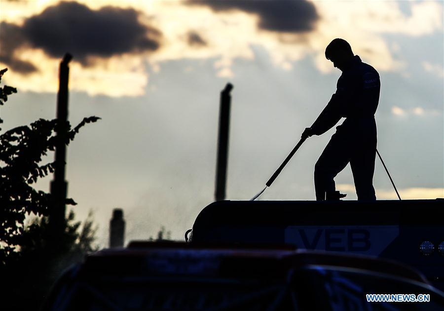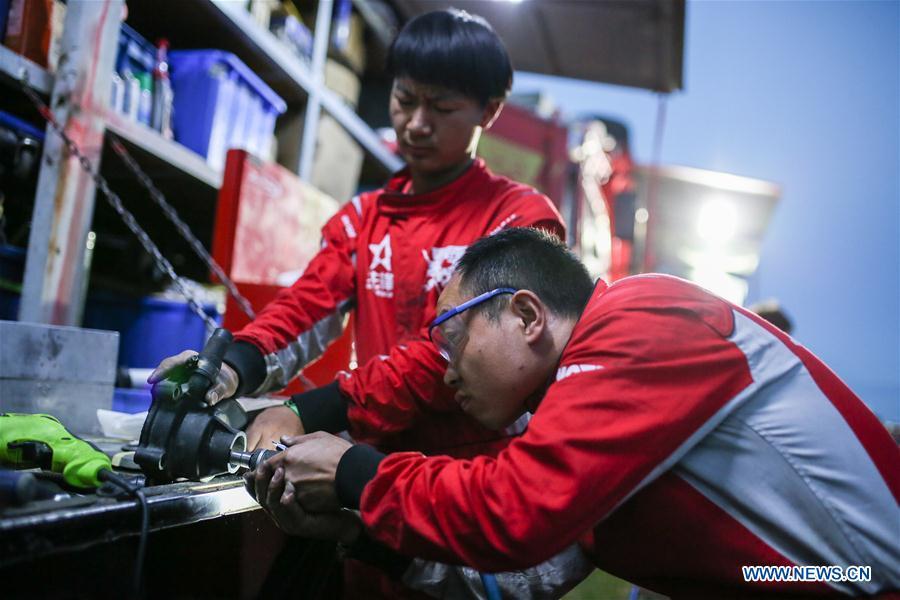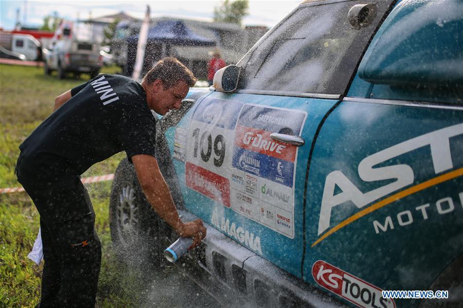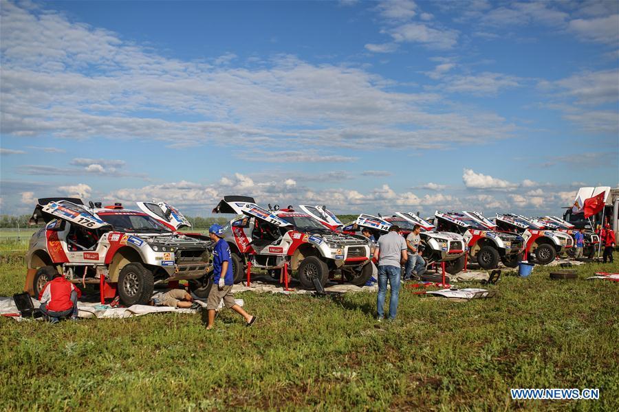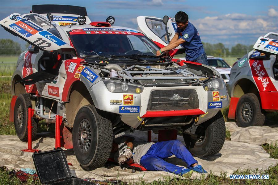 A mechanic of Russia's Kamaz-master team works in the drivers' camp of the Moscow-Beijing Silk Road rally 2016 in Ufa, Russia, on July 10, 2016. The race was cancelled on Sunday due to weather condition. (Photo:Xinhua/Maxim Ozerov)